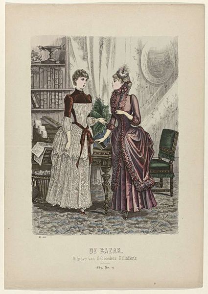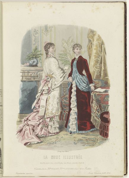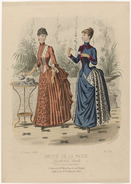 Curator: Take a look at this lovely print: "La Mode Illustrée, 1884, No. 46: Toilettes de Mme Delaunay (...)," created in 1884 by J. Bonnard. It's a watercolor illustration showcasing two women in fashionable attire. Editor: Oh, hello ladies! It looks like they’re having a tea party… or maybe gossiping about which hat to wear to the opera. There’s a softness to the scene – it feels intimate, almost like peeking into their parlor. Curator: Indeed. We see here a genre painting that presents highly constructed representations of femininity deeply embedded in its specific time, but which invites contemporary inquiry on intersectional themes such as identity, gender, and class. Editor: "Highly constructed"... that's one way to put it. All those bows and frills, and the corsets – yikes! It makes you wonder how much freedom these women really had, underneath all that… upholstery. But hey, maybe they liked it. Comfort is relative. Curator: Certainly. These fashion plates functioned as tools of social positioning. Through the depiction of such sartorial elegance, women aimed to achieve or reinforce a place within a stratified society where one's attire communicated one's socio-economic status. It begs us to ask questions of access and exclusion in a Bourgeois Paris… Editor: True, it was like wearable wealth. Though, let's be honest, as an artistic composition, the artist manages to do quite a bit with the watercolours. Notice how he captures light on the fabrics; each fold seems almost touchable! Also, there's something strangely calming about these muted pastel hues. Curator: I agree. Moreover, we must read it in context to fully grasp its historical and cultural resonance. Academic art like this was designed to uphold a very specific vision of beauty, domesticity, and female identity— Editor: A vision crafted by men, no doubt. Curator: ... precisely. Still, it presents a valuable opportunity to explore these societal constructs through art history and feminist theory. Editor: Well, for me, beyond the social implications, this watercolor just tickles my fancy with its aesthetic sensibilities. But absolutely, engaging with art involves acknowledging all its many layers! Curator: Precisely. Thank you for engaging with this complex print with me! Editor: The pleasure was all mine.