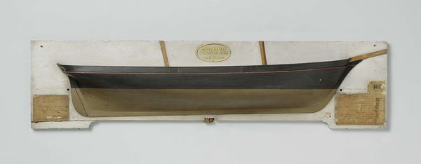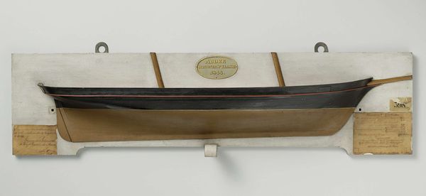 This is a half model of a 6-Gun Schooner-Brig created by Rijkswerf Rotterdam. The sculpture presents a vessel bisected along its longitudinal axis, mounted on a board. The upper hull is dark, while the submerged part is a lighter hue, divided by a precise line. The division creates a striking contrast that invites contemplation on what is visible versus what is hidden. The waterline, where the two colors meet, symbolizes a threshold, a boundary between worlds. This recalls structuralist ideas of binary oppositions, where meaning is created through contrast. The ship itself represents a signifier of exploration and power. The division of the ship can be interpreted through semiotics as a symbol for transitional space, which exists between fixed categories, and suggests a deconstruction of maritime power, leaving viewers to contemplate the relationship between progress, exploration, and control.
