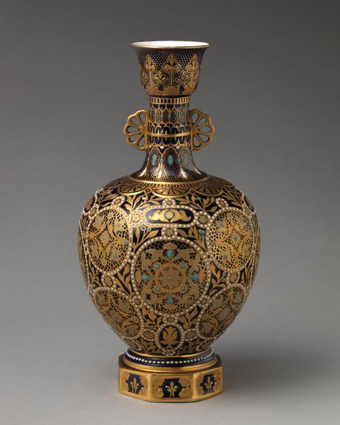 Editor: So here we have a ceramic vase, likely dating from around 1884 to 1905. What immediately jumps out at me is the riot of color, almost jewel-like in its intensity. What strikes you first? Curator: You know, when I look at this piece, I feel like I'm peering into a garden at dusk. All these details feel deliberately ornamental, each brushstroke carefully placed like it's some type of magical equation, maybe the recipe for a fairy potion. I wonder, do you think this feels traditionally Western, or do you get echoes of something further East? Editor: It does have a sort of luxurious, vaguely Eastern feel. All those patterns... I mean, could it be trying to imitate, say, Persian metalwork? Curator: Perhaps! And if so, what's the story that this vessel whispers to you? It's ceramic, but wants to be mistaken for metalwork. A mimic playing dress-up? The piece is signed 'James Callowhill.' Callowhill often did decorative ceramics, and they were considered exquisite then, like museum-quality examples today! Do you get that from the piece itself? The expertise that Callowhill brought? Editor: Absolutely. Seeing the detail close up, you can tell this isn't some mass-produced thing. So, a ceramic piece mimicking metalwork... is there something in that tension between the humble material and the luxurious aesthetic? Curator: Ah, that’s the dance, isn't it? Pretension against humbleness. Craftsmanship pushing boundaries. I suppose the next time I look at it, I won’t take it at face value. There’s an imposter dancing with intent, but you need to have intent to fully appreciate the performance! Editor: I hadn't really considered that tension. Thanks for showing me a new perspective!