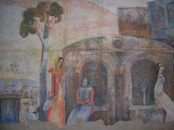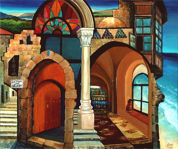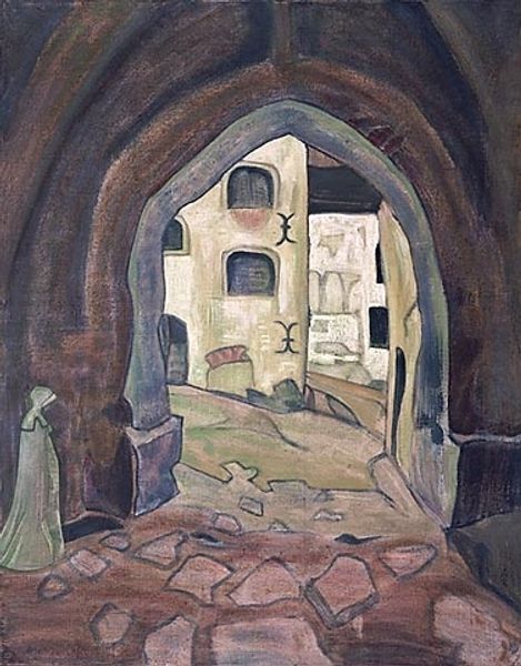 Curator: So, here we have Nicholas Roerich’s "In a Monastery," painted in 1914. Editor: Wow, that’s... intensely blue. And all those stones! They feel like they’re breathing. Curator: He does achieve an almost dreamlike, otherworldly atmosphere, doesn't he? Roerich was fascinated by medieval architecture and symbolism. He employed watercolor here to create a landscape imbued with the gravity of holy places, where everything almost becomes a living part of this historical setting. Editor: It's incredible how the materials themselves—stone and metal—speak volumes about labor and purpose. I'm also stuck on how watercolor gives a very immediate feel, even though we're looking at such old forms and methods. Curator: Right, the very texture of watercolor, its transparency, is able to provide depth here. Speaking to materiality, I read somewhere that Roerich experimented with tempera emulsions, which have this egg-yolk binding agent—apparently to speed drying time so his color blending and symbolic style are all in synch, as it seems. Editor: Tempera would definitely affect the look and longevity of the pigment! The light and shadow almost look carved, like those faces decorating the top of the arched entryway to the doors, bringing our attention directly into the architecture's construction. Curator: You can almost imagine the artist’s careful planning. In this case, there is a lonely, kneeling woman by the doorway who may symbolize humility and supplication in these rough, yet glorious surroundings. Editor: I'm drawn to the idea of craftsmanship here – that religious devotion connects to an artistic one, too, if we consider this kind of masonry. I am certain Roerich gave such thought. Curator: Perhaps it’s this focus on the craft and spiritual meaning that transcends time and artistic "value," however one measures it. Editor: Yes. I will never be able to look at it in a vacuum—what it cost to create—so Roerich's approach has brought me a deeper perspective on what sacred space truly represents for individuals and communities.
