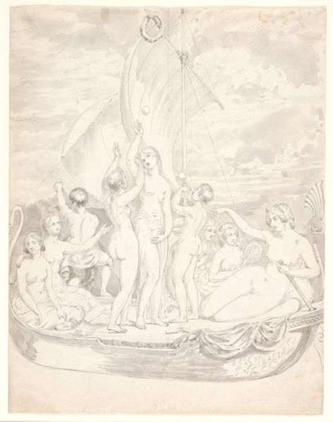 Editor: Here we have Honoré Daumier's "The source of the Seine is the Cote d'Or, and it empties into the Channel. On its way it traverses Paris where the inhabitants escape the summer's heat and try to find freshness and purity in this river, plate 3 from Les Baigneurs," created in 1839. It's a lithograph printed on paper. It seems to depict a crowded scene of people bathing in what I presume is the Seine, judging from the title. There's a real sense of... humanity, I guess, a bit chaotic and not at all idealized. What do you see in this work? Curator: What I find compelling is how Daumier uses lithography, a relatively accessible printmaking technique, to depict the realities of urban life and the burgeoning middle class. Consider the social context: Paris was undergoing massive urbanization. Daumier's choice of a printmaking medium meant these images could be widely distributed, consumed, and commented on by a broad audience. This shifts our focus from Daumier as a singular artistic genius, towards understanding the piece as a cultural artifact reflective of its production, distribution and consumption within the nineteenth-century Parisian society. Think about the labor involved in both creating and consuming these images – the printers, the vendors, the people purchasing or viewing them. What is the "value" here? Editor: So, less about individual artistic skill and more about the process and accessibility? Curator: Precisely. We have to consider the means of production as equally important as, perhaps more important than, Daumier's individual intention or artistic vision. Also, do the materials challenge or confirm assumptions of "high" art versus craft? Editor: That’s an interesting point. It’s not an oil painting destined for a salon, but a mass-produced print offering social commentary... I guess I was viewing it through a more traditional art historical lens. This gives me a whole new appreciation for the work. Curator: Indeed. Thinking about art from a materialist perspective helps us understand how art is intertwined with labor, consumption, and social hierarchies. It certainly changes the way we assess its value. Editor: Absolutely. I'll never look at a print the same way again. Thanks for opening my eyes to the material reality behind this image!