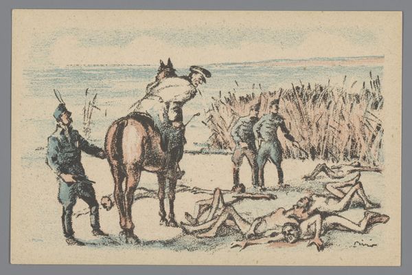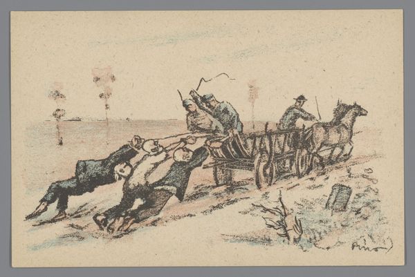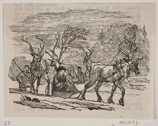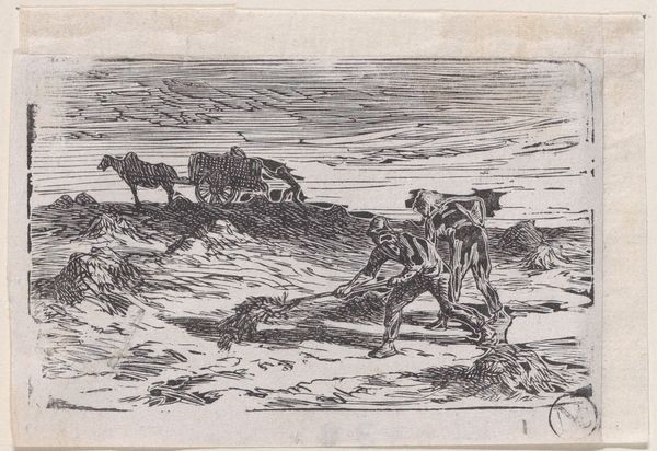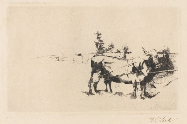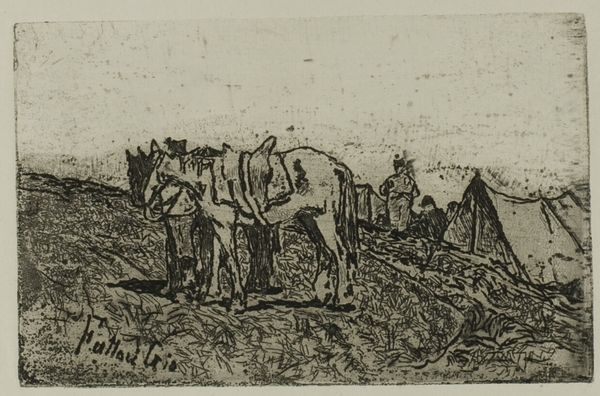 Editor: Right, so, next up is Charles Jacque’s etching, "Plowman and his Team Resting" from 1846. It’s a pretty small print, housed at The Art Institute of Chicago. It gives me this feeling of quiet weariness, but there's also a certain beauty in its depiction of labor, don't you think? What do you see in this piece? Curator: Weariness, absolutely. And beauty, yes, the hard-won beauty of honest work. It whispers of Millet, doesn't it? This is Jacque, etching in 1846. Look how the landscape sighs – those soft lines suggesting rolling hills, tired beasts. See the tiny figure slumped beside the plow? Feel his exhaustion mirrored in the bowed heads of his team? The Impressionistic style makes the scene relatable, down-to-earth. He rests; they rest; we rest in looking. It’s incredibly human, incredibly moving. What do you think about that? Editor: That connection to Millet makes total sense! And the "sighing landscape"—I love that description. It definitely emphasizes the shared exhaustion. It makes me consider my own relationship with rest and work in a different way. Curator: Indeed. He speaks of the human condition through animals. A mirror for our times, and indeed, any time. Are we not all beasts of burden in our own way, and in search of our green pasture of respite? What a marvelous rendering of a deep shared yearning! Editor: That's a beautiful way of putting it. This makes the work so much more impactful and deeply resonant for me! Curator: Yes. The artist found rest with the plowman, and so too might we. Thanks for joining in my reverie. Editor: Thank you so much! This was so helpful and inspiring!