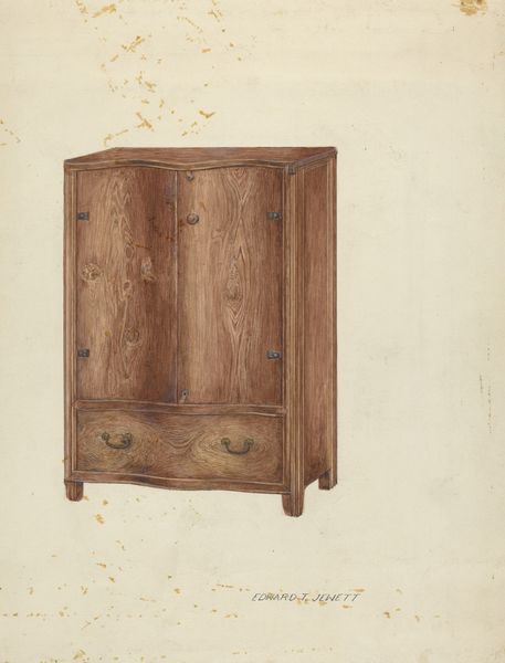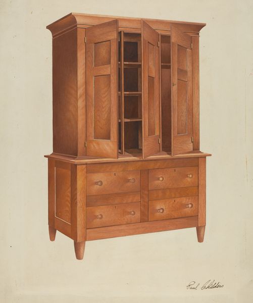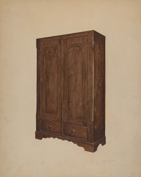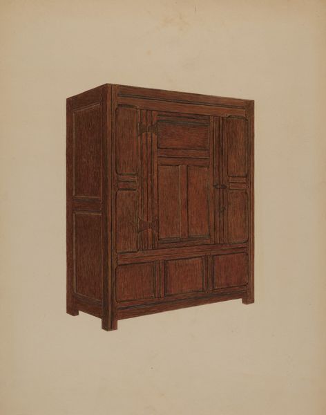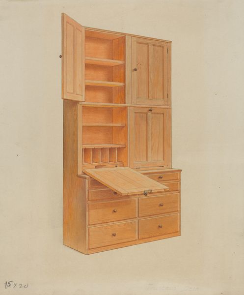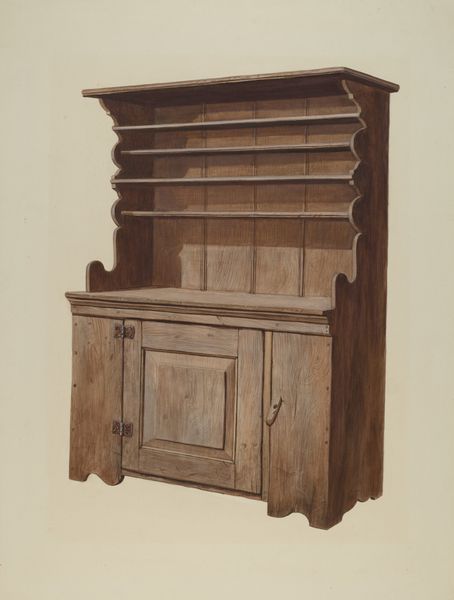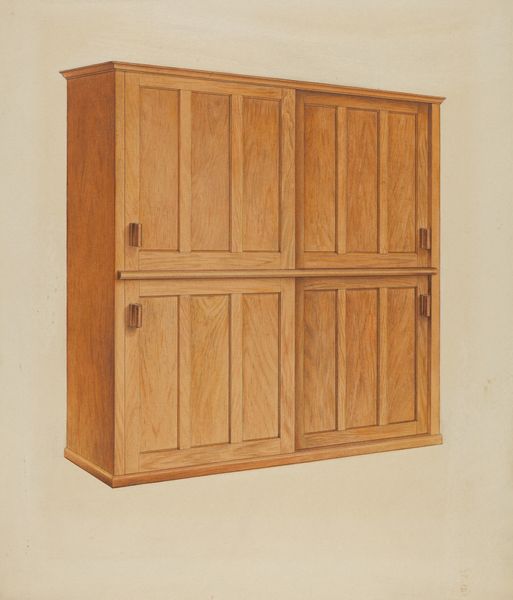 Editor: So, this is Joseph Sudek's "Kitchen Cupboard," made around 1938. It looks like pencil or maybe even watercolor. It's incredibly detailed, almost photographic in its realism, and yet it feels...empty. What can you tell me about it? Curator: It’s fascinating how Sudek focuses on such an ordinary object. Considering its date, c. 1938, and Sudek’s base in Czechoslovakia, it can be read as an interesting comment on the shifting socio-economic landscape of the time. Ask yourself, why choose this seemingly mundane subject during a period of escalating political tension in Europe? Editor: Hmmm… Was it a political statement, perhaps, focusing on the everyday to avoid direct engagement? Curator: Perhaps not directly a "political statement" in the activist sense, but it positions the kitchen cupboard, a symbol of domestic stability and quiet functionality, against the backdrop of encroaching war. The emptiness you perceived, I suspect, is deliberate, almost ominous, no? It lacks the comforting clutter one might expect, becoming instead, a silent monument to a disappearing way of life. What materials were generally stored in the cupboard, do you think, at the time? Editor: I imagine it might hold simple, essential ingredients, tools perhaps. So, this cupboard as a symbol of resilience despite precarity? Curator: Precisely. Its stillness stands in contrast to the dynamism and displacement of the era. It makes us consider the social and historical role of imagery during turbulent times. It highlights how something as simple as a drawing can communicate cultural anxieties and resilience. Editor: Wow, I hadn’t thought of it that way. Seeing it as more than just a drawing of a cupboard really reframes my understanding. Curator: And that’s the power of viewing art through a historical and social lens. Everyday objects gain an added layer of significance.