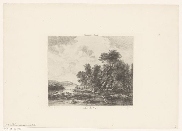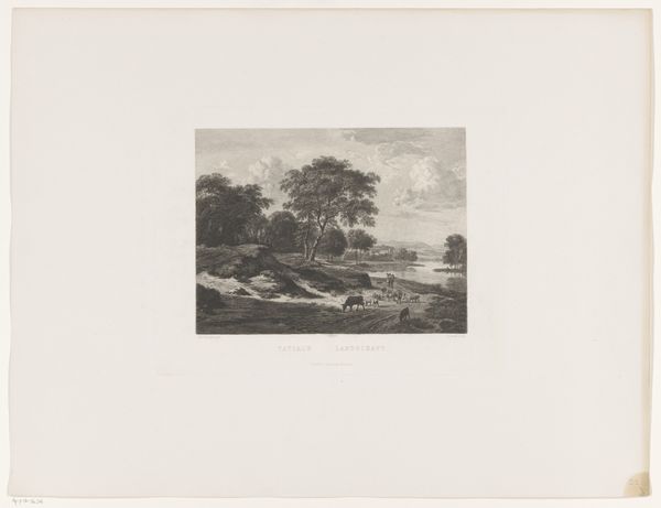 Waldemar Bøhme created this landscape with a lake using etching techniques. Note the presence of trees, a universal symbol of life and connection between the earth and sky. This motif resonates deeply across cultures, embodying growth, stability, and wisdom. The trees here stand guard over the tranquil scene, their forms echoed in countless artistic traditions from ancient tapestries to modern photography. The inclusion of grazing cattle and a lone figure along the path speaks to a pastoral ideal, a longing for harmony between humanity and nature. This resonates with a collective memory of simpler times, a motif found in classical landscapes and romantic paintings alike. The emotional power of this image resides in its quiet simplicity, engaging viewers on a subconscious level with primal symbols of nature and human existence. This etching, while modest in size, taps into a deep well of shared cultural experience.