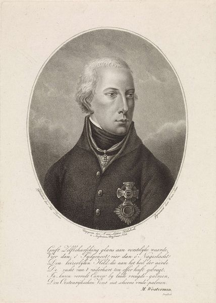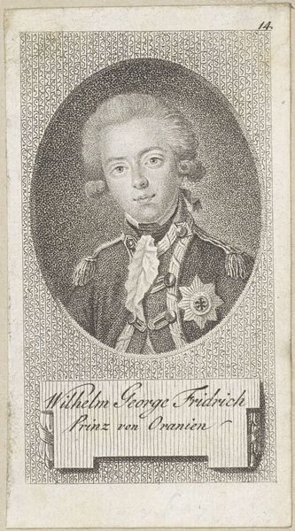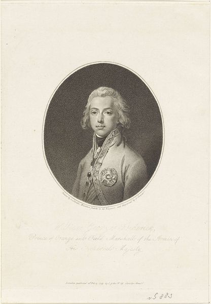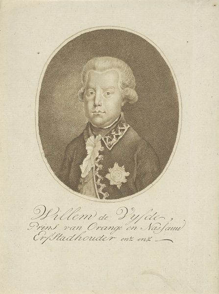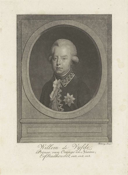 Curator: Sober, isn't it? This engraving presents a portrait of Willem V, Prince of Orange-Nassau. Created between 1787 and 1834, it's currently housed right here in the Rijksmuseum. What's your initial take? Editor: Austere, undeniably. And there's something haunting about the way the lines capture his face. It makes me think about the laborious process, all those individual strokes that go into engraving – almost like an exercise in royal myth-making, piece by piece. Curator: You pick up on something interesting there. It’s printed, a reproductive medium, inherently more accessible. Consider what that does to notions of the unique, original artwork, and the image of a royal figure like Willem V, suddenly… multipliable. Editor: Precisely! The production value contrasts so sharply with the subject's assumed privilege. The artist—whose hand remains somewhat invisible—chose a humble method to portray such an exalted figure, Prince Willem. And this engraving suggests a desire to disseminate this image, turning the Prince, in essence, into a reproducible brand. The choice of printmaking for someone who no doubt commissioned lavish painted portraits... intriguing, to say the least. Curator: It’s fascinating to consider it in relation to history painting, which aimed for grand narratives and moral lessons. Here, the focus shrinks to a more intimate scale, yet it still projects authority through careful detail: the meticulously rendered clothing, the imposing wig. And let's not forget that decorative medal, a shining mark of prestige. One can also note some details on the border lines. Editor: Absolutely. But what intrigues me, even more, is how this engraving demystifies Willem V by making his image readily available. It exposes the machinery, if you will, behind creating and preserving power, reducing the Prince to layers of ink on paper. The materiality becomes inseparable from the message. Curator: It’s a delicate balance. This piece feels like an exploration of how an image, repeated and distributed, solidifies a narrative—especially during periods of upheaval and change. It reflects the shift in artistic tastes towards neoclassicism, with an idealized rendering. Editor: Indeed. It exposes, almost inadvertently, the economics and social structures inherent in even the seemingly simplest artwork. Makes you consider how “low art” often does the work of “high art”, only without the pretense. Curator: Exactly. So much to unravel from this…relatively small…print. It offers a glimpse into a moment in history, mediated through materials and reproducible techniques, shifting perceptions, and lasting legacies. Editor: Yes, it’s left me questioning not only Willem V's reign but the very nature of artistic creation and its role in reinforcing – or, perhaps subtly undermining – those who held the reins.