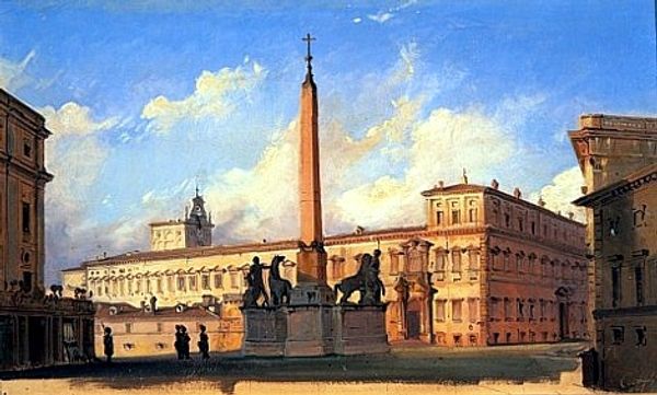 Editor: Bernardo Bellotto’s "Rome: View of the Piazza di San Giovanni in Laterano," painted in 1744, really strikes me with its almost photographic detail. There's something so still and monumental about it. How do you interpret this work? Curator: Well, first, let's appreciate Bellotto’s sheer mastery of perspective! It’s like stepping back in time, isn't it? Imagine standing in that very piazza. Bellotto wasn't just painting buildings; he was capturing the spirit of Rome, a city steeped in history and buzzing with… well, considerably less traffic back then. The Baroque architecture practically sings, doesn't it? Have you ever just felt dwarfed by the grandeur of it all? Editor: Absolutely. I'm also intrigued by the ordinary people included. Curator: Precisely! They're not grand figures, are they? They're going about their day, completely unaware they are part of this magnificent tableau. It gives us a window into the past, not just of buildings but of everyday life, wouldn't you agree? Editor: Yes, definitely. It brings it all down to earth in a way. Curator: And look at the light! Notice how Bellotto uses the light and shadow to accentuate the architectural details. To me it feels less a representation and more like a love letter to Rome, and its quieter, elegant cadence. Does this make sense, in your opinion? Editor: It does, actually. It's made me see past the technical skill to the emotion behind it. Thanks for sharing your perspective. Curator: My pleasure! It's wonderful to see these old masters with fresh eyes. Who knew a painting could whisper stories of everyday grandeur, right?