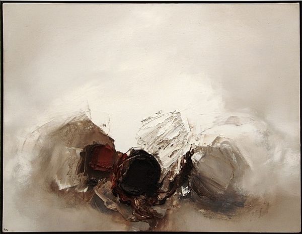 Luis Feito made this painting, titled "165", with oils and a real sense of drama! The way Feito builds up the paint is really something, isn’t it? Look at how the thick white impasto contrasts with the thin washes of grays and browns. It’s like he’s sculpting with the paint, creating a real sense of depth and texture. In the upper left, there's this luminous cloud, all soft and diffused, that seems to be emerging from the darkness. Then your eye travels down to this craggy, textured mass, built up with globs of white and dark paint. It’s almost like looking at a landscape at night. The physicality of the paint really amplifies the emotional impact of the piece. It’s not just an image; it’s an experience. Feito reminds me of Antoni Tàpies, who was also working with texture and materiality in really interesting ways. It’s all part of that conversation about what painting can be.