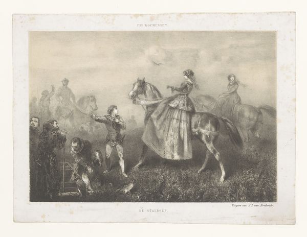 Curator: This is "Coaching" by Constantin Guys. Look closely and you'll see it is rendered in pen and brown ink with brown wash over graphite. Editor: It feels like a fleeting dream, or a memory half-forgotten. The blurring of ink makes it seem like we're glimpsing a scene from the past through a hazy window. Curator: Guys worked as an illustrator for the Illustrated London News, and pieces like this allowed him to capture scenes of modern life with a unique flair. One can see the roots of the French Flâneur here. Editor: Absolutely. The way the horses surge forward, almost leaping off the page, infuses the whole scene with energy, but it’s also a statement about class and wealth. Curator: True, a testament to the spectacle of transportation and social display. You notice the trees in the background? It's as if the natural world itself is a spectator to this parade. Editor: The trees are almost skeletal. But despite the muted tones, there's something lively here. It reminds me that art can be found in the simple act of observation, the mundane elevated to the extraordinary.