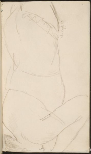 Curator: Let's turn our attention to this unassuming drawing, "Torso van een naakte vrouw," created sometime between 1906 and 1945. It resides here at the Rijksmuseum. Editor: It has a tentative air. Like a fleeting thought captured with a light touch. The sketchiness lends a feeling of intimacy. Curator: Indeed. This sketch offers a glimpse into the artistic process, it suggests an informal studio practice rather than a finished work intended for public display. I'm most drawn to the likely sitter, an unknown model whose image, here, is devoid of adornment. What might she have thought, posed there? What were her socio-economic circumstances? Editor: I see how the artist’s use of pencil creates a delicate tonal range, especially around the torso. The line varies, sometimes fading to almost nothing, at others, bolder to define the form. Note the emphasis on shape instead of detail. The lines are efficient. The way the planes suggest volume and weight interests me. Curator: Precisely. These sketches, ones likely scribbled in a personal sketchbook, become invaluable documents in revealing the ideologies prevalent at the time concerning the representation of women. It invites discussions about how artistic freedom and conventions were negotiated and it allows to reveal what type of cultural assumptions informed their representation. Editor: To me, its incompleteness amplifies the sense of dynamism and energy. One almost gets the feeling of seeing the model move in real-time through an almost ghost-like figure off to the side. This one provides only minimal contour, whereas the second displays bold strokes with its heavy lines which capture the distribution of mass. Curator: An interesting observation! It really does ask us to ponder the power structures inherent in artistic representation, whose perspectives dominate? Whose bodies are displayed, and under what conditions? Editor: I see what you mean! As we conclude, I’m left with the feeling of a quiet dialogue between the artist, model and viewer. Curator: And the act of witnessing art history as it unfolded. I agree!