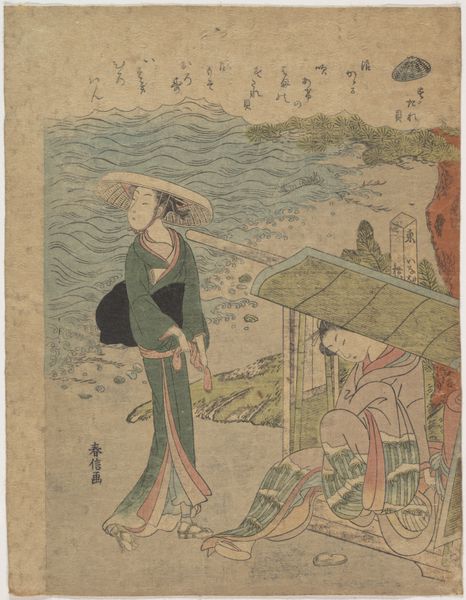 Suzuki Harunobu created this woodblock print, The Bamboo-Blind Shell, part of a series of shells, sometime in the mid-18th century. Dominating the scene, the bamboo blind, or ‘sudare,’ traditionally signifies privacy and concealment, often hinting at intimate, interior spaces. The sudare is not merely a screen; it is a symbolic threshold. Think of similar motifs, such as the curtains in Renaissance paintings, that conceal and reveal. The meaning of the ‘sudare’ evolved from the Japanese Heian period, when it was mainly used by aristocrats, evolving from a screen of status to a symbol of intimacy, and even clandestine meetings. Here, the woman hidden behind the blind evokes a sense of longing and unseen beauty. The composition, full of such gestures, stirs the depths of our collective memory, engaging us with the universal themes of desire and mystery. It is a cycle, this revealing and concealing, passed down through art, forever resonating within us.
