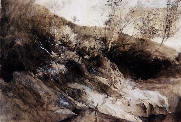 Curator: John Ruskin painted this evocative scene, "In the Pass of Killiecrankie," around 1857, likely using watercolors en plein-air. The way the light dances on the rocks and water creates such a strong impression. Editor: The textures of those rocks are almost tactile. There is a roughness to them that suggests a hard-won beauty, carved by the currents. I’m interested in this pass, this 'Killiecrankie'. Is this a place with historical resonance, perhaps a site of struggle? Curator: Indeed, this location is quite significant. The Pass of Killiecrankie was the site of a major Jacobite victory in 1689. But I'm more captivated by how Ruskin employed plein-air techniques to portray the landscape’s raw immediacy. Think about lugging all your equipment into the Scottish Highlands in the mid-19th century! Editor: So this location bears witness to a rebellion attempting to reinstate a Stuart king, infused by bloodshed? Landscape painting wasn't ever merely about scenery, right? There’s a romantic yearning for lost causes embedded in the picturesque appeal that this artist seems so fond of! But I agree, one can definitely feel his devotion for the geological construction of his landscape. The stratification of its rocks evokes how natural resources can be deployed as signs of nationalist or colonialist claim. Curator: Absolutely, Ruskin had a profound impact on art criticism and social thinking during the Industrial Revolution, influencing many with his views about manufacturing. Considering how he champions handmade crafts, wouldn't it be interesting to examine what he intended the role of labor, value and national identity to mean at the time? Editor: He makes me think about the current crises that indigenous people of Scotland still experience in terms of displacement and relocation. A pretty landscape painting becomes loaded with complex histories when viewed in light of identity, diaspora and cultural resistance. Curator: A watercolor of rocks takes on greater resonance thanks to this perspective. What appeared at first glance as scenic quickly transforms to encompass discussions about conflict, national character and political upheavals. Editor: Viewing Ruskin’s watercolor then asks the questions: Whose land is it, and who has the right to represent it? Curator: Thank you, a vital perspective! It enhances our awareness. Editor: The painting seems innocent at first; but that artistic 'innocence' warrants exploration.