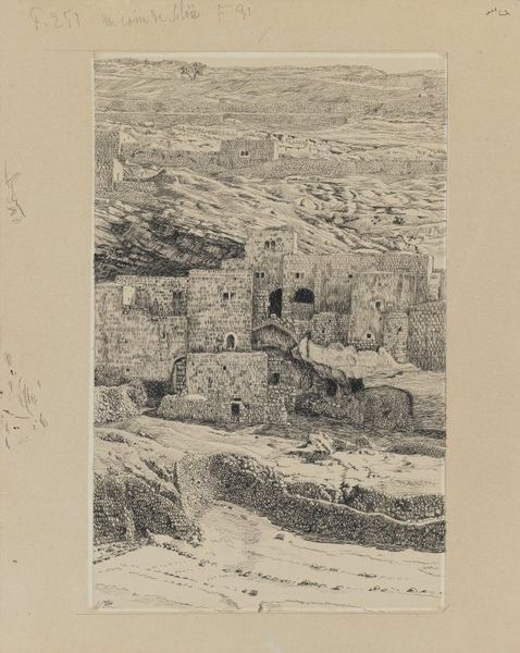 Curator: Immediately, I'm struck by its quietude; the sparse lines seem to suggest a vast emptiness. Editor: That's perceptive. What we have here is James McBey's etching, "Ras-El-Ain," created between 1918 and 1919. It showcases a landscape with architectural ruins. As a print, it makes some of the formal choices quite accessible to audiences of the time. Curator: Yes, but those choices are precisely what commands our attention now. Look at the stark contrast of light and shadow; the lines forming the architecture against that vast expanse. How is it even constructed formally? It nearly vibrates due to its minimal means. Editor: I believe that vibrancy speaks to the context in which McBey created this. World War I had just ended, and he worked as an official war artist. His landscape might mirror not just geography, but also a post-war world, marked by ruins and reflection, its structures charged sites. The very act of documenting the area positions it historically. Curator: Interesting, though even divorced from its historical placement, its visual syntax offers significant engagement. Take for example the composition of the architectural ruins in parallel to the people: is it truly a picture of "society" in its traditional mode? Editor: Certainly. McBey wasn't merely depicting a scene but presenting a specific perspective colored by colonial power structures. The architecture and even the rendering of the indigenous population speaks to those imbalanced social structures and their role as supporting mechanisms within an environment that, due to British strategic investment and other geopolitical circumstances, was facing major demographic changes at that time. Curator: Perhaps. Nevertheless, I would highlight how the artist exploits tonal range for expressive effect. The sparse applications of ink create such depth using such simplistic line and shape. That, combined with this vastness, remains as evocative now as the political message was didactic then. Editor: That said, examining McBey’s positioning and intent enriches our engagement by acknowledging its historical baggage and the conditions by which such landscapes are formed through human interference and the socio-political currents of that age. Curator: Ultimately, "Ras-El-Ain" demonstrates an exemplary harmony between stark composition and historical weight, leaving one both contemplative and moved. Editor: A truly multifaceted work—as compelling for its etched lines as it is for its etched place in history.