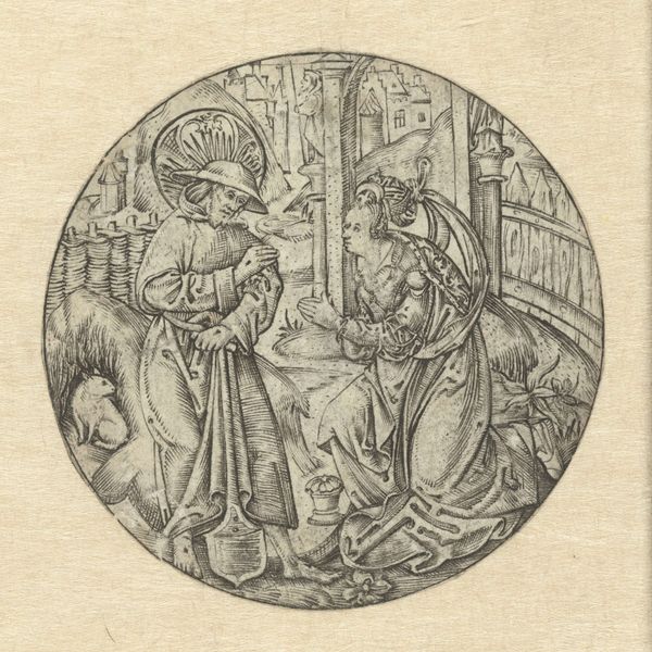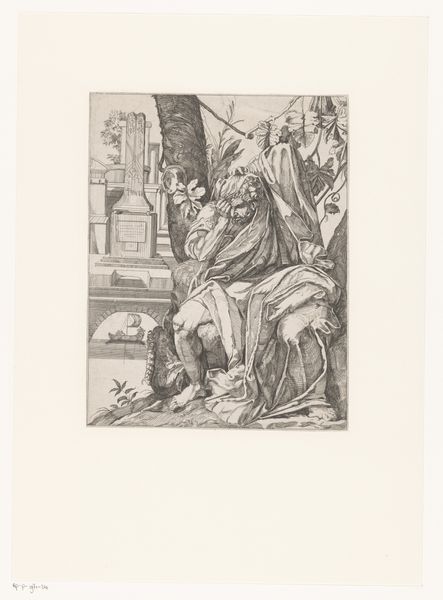 This small, anonymous print shows David playing the harp. The harp, an ancient symbol, is more than just a musical instrument; it’s a conduit for divine expression. Historically, music, particularly from stringed instruments, was seen as a way to connect with the heavens, a theme that resonates across cultures from the lyres of ancient Greece to the harps of Celtic lore. Consider David's kneeling posture, an emblem of humility and devotion. We find similar gestures throughout religious art. Think of supplicants in medieval paintings or figures in Renaissance frescoes. The act of kneeling before a higher power speaks to a deeply ingrained human desire to seek guidance and redemption. These symbols, repeated across time, engage our collective memory. This humble posture speaks to our subconscious recognition of vulnerability and reverence, emotions that bridge millennia. Thus, the image of David transcends its immediate context, resurfacing across history, evolving, and acquiring fresh significance in diverse eras.