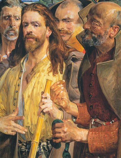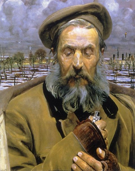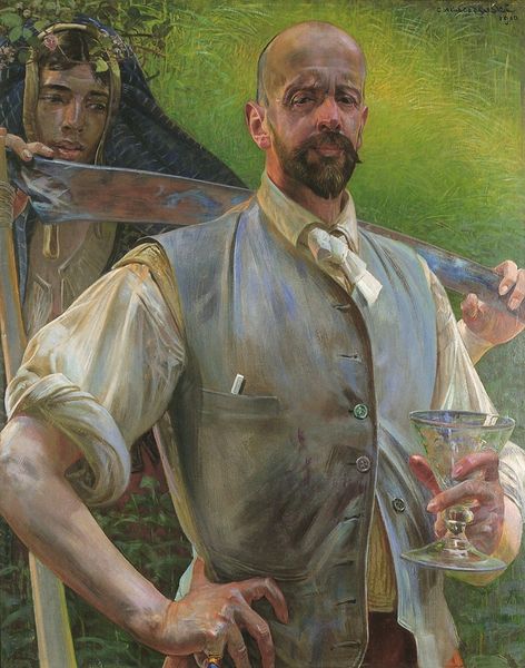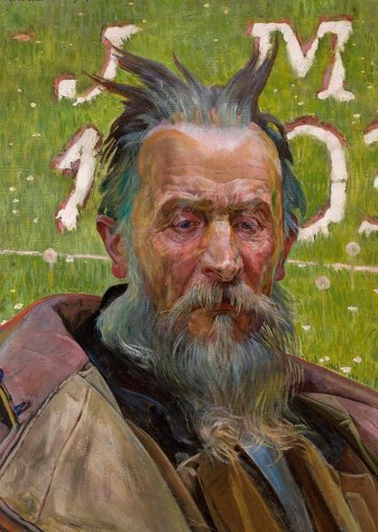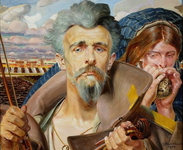 Curator: Jacek Malczewski painted "Story of a Song – Portrait of Adam Asnyk" in 1899. I find myself drawn to how the artist depicts this noted Polish poet amongst figures of what appear to be satyrs. Editor: My first impression is one of melancholy. The pallid figures behind the poet, wreathed in what look like decaying foliage, exude a certain decay. They give me a visceral, if unsettling, feeling. Curator: Absolutely. Consider the positioning. Asnyk, in his somber coat, is sharply grounded in the real world. Behind him, the figures seem almost spectral, emerging from the mists of a past perhaps both glorious and troubled. It speaks to Poland's complex history and its national identity forged through poetry and art. There's a dialogue happening between the tangible present and an almost mythological past. Editor: Yes, and the satyrs themselves, these ancient symbols of revelry and music, carry layers of meaning. The instruments held by each satyr hint at creative inspiration but rendered as hollow or somehow stunted in potential. Is Malczewski suggesting the burdens and societal constraints imposed on creative genius? It’s as if Asnyk is both supported and haunted by tradition. Curator: Precisely! And Asnyk's own expression is key. He is not merely a passive subject. His face is etched with thought, perhaps a grappling with his role as a poet, a shaper of national consciousness during a period of intense political upheaval. This is not simply a portrait but a complex statement about the relationship between art, artist, and societal expectations. The gaze itself seems burdened, weighed down by historical awareness. He almost appears to be looking beyond us and reflecting on something just out of sight. Editor: It's fascinating how the artist uses classical symbolism not as simple decoration, but to frame a modern Polish experience. Malczewski successfully layers pagan motifs atop Asnyk's figure to add depth. The single yellow leaf near Asnyk further contributes to the painting's mournful character. It suggests endings and the ephemeral nature of existence. It really leaves one contemplative about the intersection of art and memory. Curator: Ultimately, I believe Malczewski captures the weight of legacy, the ongoing dialogue between a nation's past and the individual who strives to give it voice through his work. Editor: It’s an intricate and emotional experience. The figures, rich with historical association, prompt further contemplation of tradition and its influence on Polish culture.