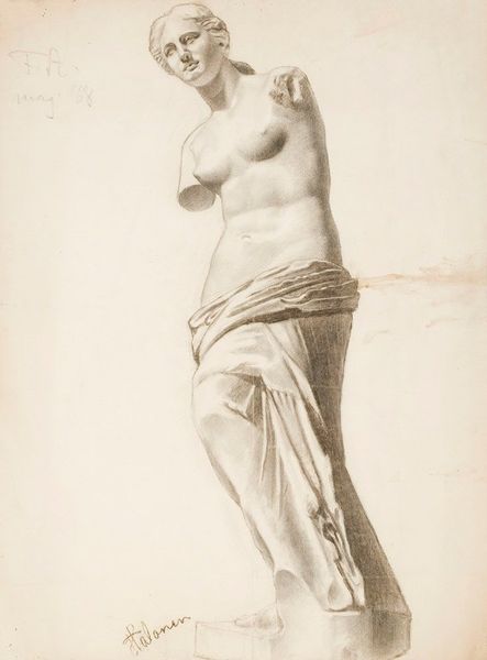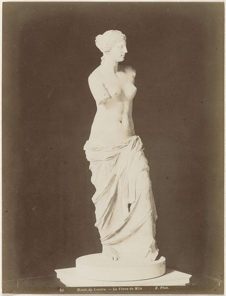 Curator: What strikes me first about this photographic print, created sometime between 1855 and 1880, is the way it freezes a moment of classical idealism. Editor: I see a certain stillness, yes, almost melancholic. It's sepia tone contributes to a sense of something distant, something irrecoverable. But tell me more about what exactly we're looking at here. Curator: It’s titled "Sculptuur van Venus in het British Museum in Londen"—a study of a sculpture of Venus. This photograph is fascinating, a copy of a copy of antiquity. It's another layer of cultural interpretation. How do you read Venus's positioning in this medium? Editor: Well, putting Venus, an icon of idealized beauty, in the context of the 19th century through photography is powerful. During the 19th century, we had this rise of scientific inquiry, the positivist ideal to "measure" reality, a direct contrast to art, right? Photographing her implies ownership, study. But the sepia, again, this choice in coloration, feels both distant and immediate at once, like a removed but not untouched past. Curator: I find it fascinating how Venus's familiar pose becomes something slightly different here, almost vulnerable. It contrasts with the active gestures in her arms, gesturing towards self-presentation, and at the same time almost defensively blocking it. What might that have meant to viewers in the late 19th century? Editor: Absolutely. You've hit something vital. The pose evokes both classical dignity and something much more unsettling. Was there an attempt to use historical precedent to justify some contemporary social narrative or desire, but with it the unsettling truth that those are constructions too? Who does she truly represent and what purpose does her frozen beauty actually serve? Curator: That tension, between power and passivity, speaks volumes, doesn't it? I think it points towards art's fascinating dance of representing our ever-evolving interpretations and ideas about ourselves. Editor: Agreed. This piece really gets under the skin and into the messy history of representation and interpretation, which is always fraught and subjective.
