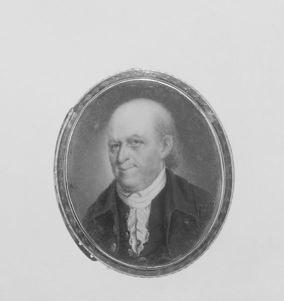 John Ramage painted this miniature portrait of Theophylact Bache, likely in the late 18th century, using watercolor on ivory. The oval format, a common choice for portrait miniatures, presents the sitter in a tightly cropped view. The artist’s subtle handling of the medium gives a soft, almost luminous quality to the face, which is framed by the dark, contrasting tones of his coat. Ramage’s technique invites us to consider the semiotics of portraiture at this time, with its delicate balance between representation and idealization. Bache’s identity is articulated through the codes of attire and pose. The meticulous attention to detail, from the texture of the hair to the subtle rendering of the fabrics, underscores a desire to capture not just a likeness, but also the sitter's status. Ultimately, the lasting impact of this work resides in Ramage's ability to capture the essence of a person within the confines of such a small space.