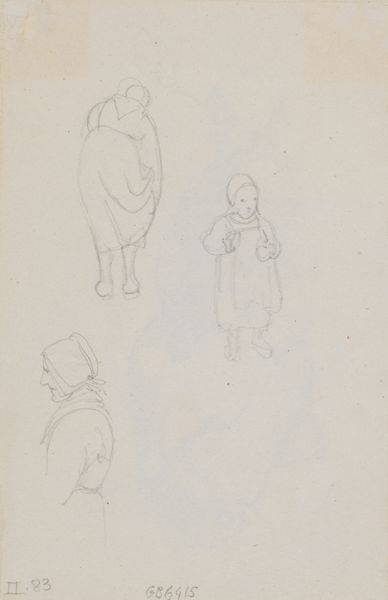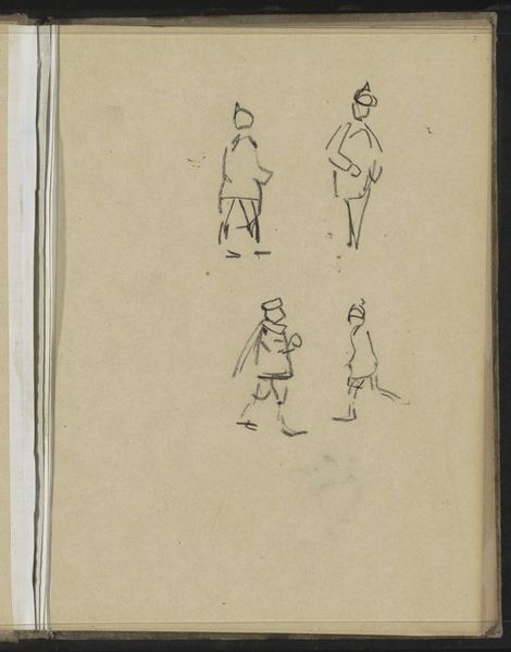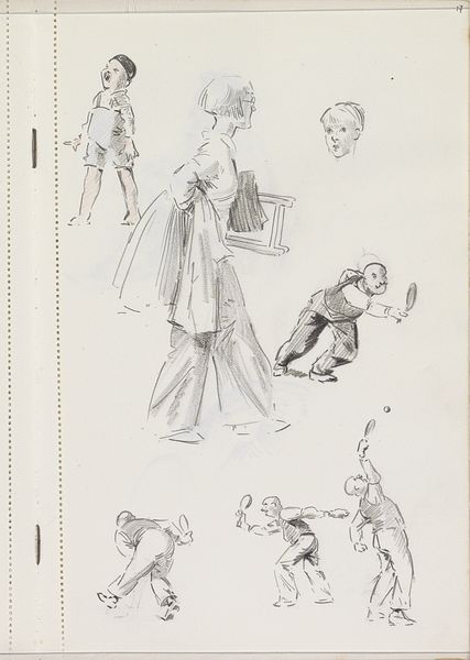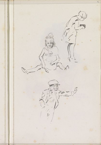 Editor: This is "Jongen op klompen en een zittende peuter," or "Boy on clogs and a sitting toddler" by Otto Verhagen, made around 1922 to 1925. It’s a pencil drawing on paper. I’m immediately struck by its informality. It feels like a page torn straight from the artist's sketchbook, capturing fleeting moments. What can you tell me about it? Curator: It’s tempting to view this solely through an aesthetic lens, but consider the social context. The clogs, the simple clothing—these speak to a working-class existence. The informality you noted might reflect Verhagen's connection to his subjects or his intent to depict everyday life authentically. The sketches' incompleteness further emphasizes the children's transient, unfixed position in society at this time. Do you see how this connects to broader social issues of class and representation? Editor: I do. It’s easy to see the style and miss that it's depicting a particular class and possibly making a statement about it. Are the multiple sketches on one page significant? Curator: Absolutely. Think of the sketchbook itself as a space of possibility. The repetition of the figures, the slight variations in their poses, speak to the multiple, perhaps even contradictory, ways childhood and identity are formed. Verhagen isn't presenting a definitive portrait, but a fluid exploration. What does that fluidity suggest to you? Editor: Maybe that childhood itself is a fluid state? Or that identity is something constantly being formed and reformed by your surroundings? Curator: Precisely! And, considering the time period, this could even be interpreted as a subtle challenge to the more rigid social expectations of the era. It is just a sketchbook drawing on paper but contains an early modern ideal. Editor: I didn't expect so much could be gleaned from such a simple sketch! Now I realize the art is not just the image, but also a record of the historical contexts and potential responses. Curator: Precisely! Always try to consider the artwork through an intersectional lens and the work can communicate to more audiences.
