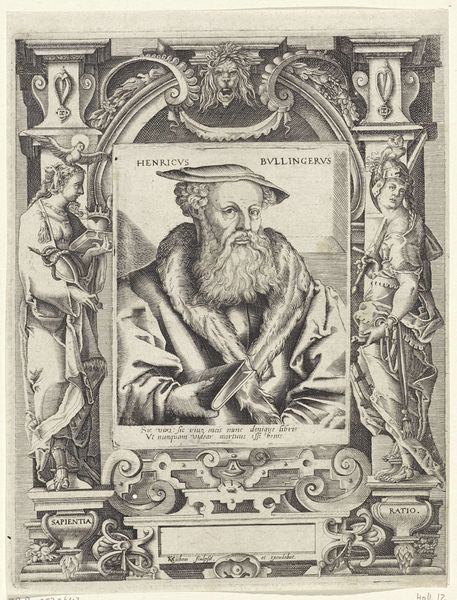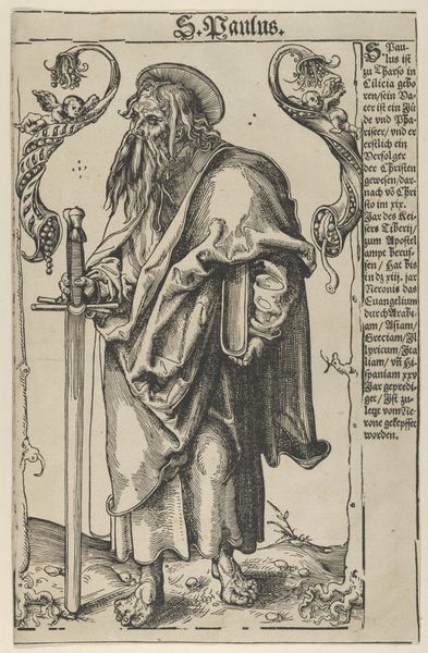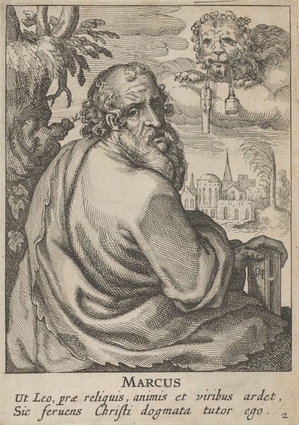 Pieter Feddes van Harlingen created this print of Matthew, one of the four evangelists, in the 17th century. During this period, the Dutch Republic was experiencing a Golden Age, marked by economic prosperity and cultural flourishing, especially in art. Here, Matthew is depicted with his traditional attribute, an angel, symbolizing divine inspiration. The landscape in the background with its towers is a look at the world that the text of the Gospel attempts to influence. What is the relationship between faith, power, and the written word? Note how Matthew is holding a pen and inkwell, ready to write, his gaze seems to be focused inward. This rendering emphasizes the importance of the individual's interpretation and relationship with the divine. The print invites us to reflect on the personal and societal impact of religious texts, as well as the complex interplay between faith, knowledge, and artistic expression.