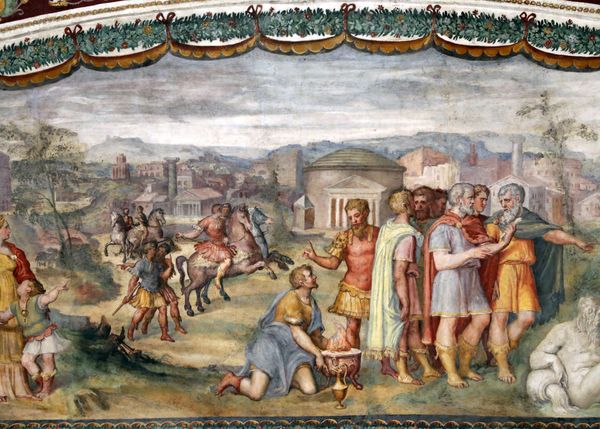 Francesco de' Rossi, known as Salviati, painted this fresco of the Triumph of Furius Camillus here in the Palazzo Vecchio in Florence, sometime in the mid-16th century. The fresco technique involves applying pigment to wet lime plaster, a process demanding speed and precision. Salviati and his workshop would have prepared the wall, applying layers of plaster, and then transferred the design, perhaps using a full-scale drawing called a cartoon. Pigments, ground from minerals and plants, were then applied directly to the wet plaster. This labor-intensive process required not only artistic skill, but also careful management of time and materials. The sheer scale of the painting speaks to both the wealth of the commissioning family, and to the labor required to complete such a grand work. Beyond the artistry, consider the social context: the mining and preparation of pigments, the skilled labor of plasterers and assistants, and the complex organization required to bring such a vision to life. Considering the materials, the making, and the context allows us to appreciate the true depth of this Renaissance masterpiece, and challenge the traditional divide between art and craft.