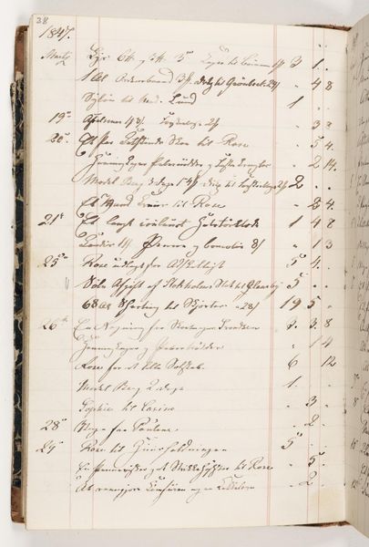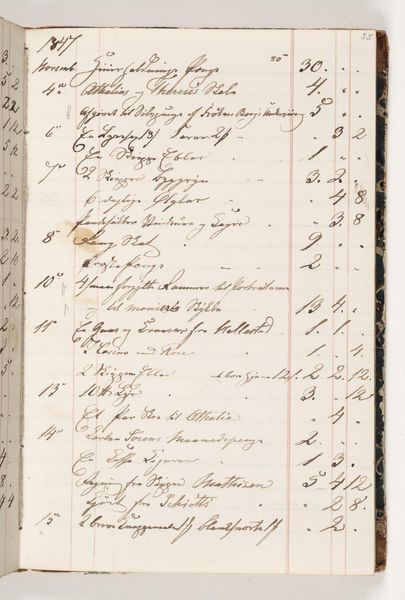 This is Martinus Rørbye’s "Regnskab 1847," made in 1847 with pen and ink on paper and now held at the SMK in Copenhagen. The dominant visual experience is one of order and precision. The page is filled with neat rows of numbers and text, each entry carefully aligned. The dark ink contrasts sharply with the pale paper, creating a stark, business-like feel. The lines and marks suggest a structured system, a semiotic code of accounting. The even distribution of text and numerals across the page indicates a balance between recording and quantifying, between language and mathematics. Rørbye here destabilizes conventional notions of art as purely aesthetic, by embedding it within the practical realm of bookkeeping. Ultimately, the artwork invites us to reflect on how systems of accounting can shape our understanding of value and exchange. The work functions not just as a historical document, but as a commentary on the structures that govern our lives.