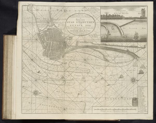 Editor: Here we have an engraved print titled "Kaart van het water voor Enkhuizen met de geprojecteerde nieuwe haven, 1720," dating back to 1720 by an anonymous artist. It depicts a map of Enkhuizen, with a fascinating grid overlaid. How do you interpret this work, particularly given its detailed depiction of both the existing and projected harbor? Curator: This isn't just a map; it's a powerful statement about Dutch ambition and control over their environment during the Golden Age. Consider the intense relationship between the Dutch Republic and water. Mapping technology advanced dramatically because of economic necessity and strategic defense. Editor: So the precision we see reflects a societal push, not just artistic expression? Curator: Precisely. These maps weren’t merely navigational tools; they were instruments of power, illustrating the human drive to impose order on the natural world. Notice how the geometric lines dissect the organic forms of the land and sea, representing an imposition of a grid-like, capitalist rationality. Where did that drive come from? Editor: Probably economics, commerce and trade and exploration, right? Curator: And that mercantile imperative drove colonial expansion and exploitation across the globe, impacting indigenous populations and their land. Cartography wasn't neutral; it was deeply enmeshed in constructing colonial power. In what ways can the language and conventions of this image be seen as actively building power for the Dutch and erasing that of others? Editor: I never considered the ethical implications embedded within seemingly objective mapping. It really makes you think about whose perspectives are prioritized and whose are erased in visual representations of space. Curator: Exactly. And hopefully, thinking critically about such maps can make us better attuned to these subtle but profound power dynamics operating today.