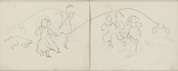 This is a sketch of two figures by Carel Adolph Lion Cachet made sometime in the late 19th or early 20th century, probably in pencil. It’s all about the bare essentials, right? Lines that barely contain the forms they describe, as if the figures might dissolve back into the page at any moment. Look at how Cachet uses line weight. The lines defining the figures are so light they seem to float, but then there are these decisive, darker strokes suggesting the ground. It’s like he’s anchoring these ethereal beings to reality. And that hexagon up there, with the cryptic annotations, what's that about? Maybe a structural element, a nod to some underlying geometry, or just Cachet thinking aloud. This sketch reminds me of the way Guston would leave his process visible, the pentimenti showing where he’d changed his mind. There’s a generosity in that, an openness to the viewer. It’s not about hiding the struggle but embracing it. Art isn't about answers, but it's about the questions.