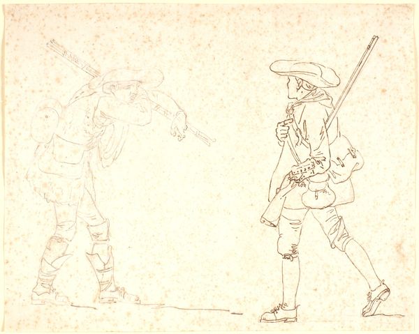 Friedrich Moosbrugger sketched this composition using graphite on paper. Here, the material’s inherent qualities of texture, and tone, imbue the artwork with a sense of immediacy, emphasizing the artist's process. The techniques employed – line work, shading, and composition – situate the artwork within a tradition of academic drawing, used for preparatory studies, or as a means of artistic exploration. The linear style captures the details of garments, from the fine suit on the left, to the armour in the middle, to the warrior's garb on the right, each suggesting different values, and classes. The amount of work involved in rendering each figure, shows a desire to show these societal differences. Paying attention to the materials and making of the drawing gives insight into Moosbrugger's understanding of societal classes, blurring the boundaries between fine art and social commentary.