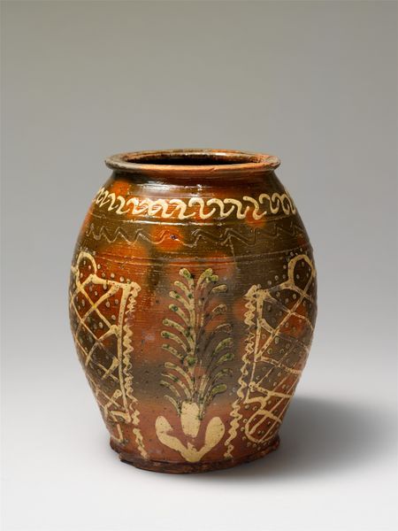 Curator: This terracotta aryballos, an oil flask, dates back to approximately 620 BC. It's currently housed at the Metropolitan Museum of Art. Editor: I’m immediately struck by the figures; they look like they’re dancing! The terracotta has this incredible, warm surface—you can almost feel the potter's hands on it. Curator: Indeed. Aryballoi were quite common in ancient Greece, particularly among athletes. They used them to store oil for grooming and massage after athletic competitions. This one presents an interesting window into that societal practice. Editor: Thinking about its purpose as a container for oil – consider how everyday items like this illuminate production. Did one workshop supply many, or were there small-scale operations tied to gymnasia, crafting objects specific for athlete users? The decorations aren't high art but practical art. Curator: Absolutely. These flasks were functional objects but their decoration reveals much about the cultural values and aesthetics of the time. Notice the intricate details, typical of Corinthian pottery, demonstrating narratives and motifs significant to that society. Editor: The figures appear lively. There's something joyous conveyed via limited dark, bold brushwork on ceramic. And there are botanical forms. Is that symbolic, referencing the olive or the floral components infused in the oil? Curator: Possibly both! The integration of figures and floral motifs creates a cohesive design reflecting a harmonious relationship with nature. These details not only aestheticized the object but likely also communicated symbolic meanings to its users. Editor: The fact that the material is relatively stable contributes to a tangible connection with a past workforce, doesn't it? Holding it gives the potential to reconstruct, reconstruct that past effort – which makes it far more interesting. Curator: Precisely! Its endurance allows it to function as an artefact of history, displaying cultural legacy; It helps us remember and celebrate these classical cultures. Editor: Looking at the overall materiality really provides access into these everyday aspects. Curator: I agree, and examining the craftsmanship enables new awareness in regards to ancient Greeks as individuals, artists, and members of their time.