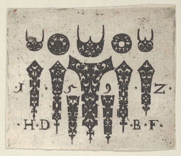 Curator: Let's discuss this striking "Blackwork Print with Eight Motifs" created between 1600 and 1620, crafted by Claes Jansz. Visscher. It's a captivating display of Baroque ornament, currently residing at the Metropolitan Museum of Art. What are your first thoughts on encountering it? Editor: My first thought is how graphic it is. The stark black shapes against the pale paper create a powerful contrast. The forms feel simultaneously ancient and modern. The array of distinct elements has this fascinating push and pull that I appreciate, creating almost like an intriguing, abstracted family of patterns. Curator: Precisely! The artist created these prints for artisans like goldsmiths and textile workers, functioning as an inspirational template for intricate detailing and the decorative embellishment so characteristic of the era. Editor: Absolutely. It's fascinating to see this historical artifact serving as almost a form of accessible pattern design. In our modern landscape oversaturated with design and imagery, this print invites a reflection on cultural standards in art, luxury, and what design choices become commonplace across class structures in various parts of society. The geometric rigor, alongside stylized florals, speaks to a desire for order, but also beauty in design. Curator: That intersection is where the work lives, indeed! The carefully selected geometric patterns and flora-derived shapes highlight the natural world transformed into idealized visual symbols, each echoing historical visual patterns—repeating stories through recognizable yet novel iconography. Look at the geometric precision, reflecting classical architectural principles merged with the flowing lines, that is typical of Baroque ornamentation. Editor: It feels like an embrace of duality – strict geometry existing beside these naturalistic patterns, creating dynamic balance. As ornament, this challenges contemporary expectations for art because of the implication it be secondary or merely 'decorative.' But consider what art of the people really means. Everyday objects as canvases are very political. Do these prints suggest the democratization of Baroque visual ideals? Curator: Certainly! I think this reveals art's capacity to permeate different aspects of society through symbol. We often view the past through high art, yet designs for "everyday" items perhaps allow a clearer vision into societal norms and desires, precisely because its distribution has the potential to be far more democratic. It makes one think about how meaning evolves over time. Editor: A powerful piece indeed, prompting contemplation on how society encodes aspirations, fears, and aesthetics in its collective imagery. It leaves me questioning how future societies will interpret the symbolism of our current patterns and images.