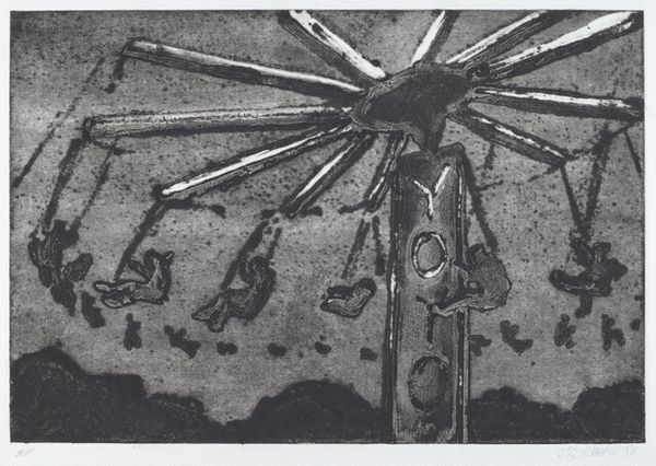 Editor: So, this is "The Great Bird" by Hans Achenbach, combining engraving, etching, monotype and other drawing/printing techniques. It feels almost like looking through fog. What formal elements stand out to you? Curator: Immediately, I am drawn to the dynamic tension between the foreground and background. Notice the strategic use of horizontal lines, a recurring motif throughout the piece. How do these lines contribute to the spatial ambiguity? Editor: They almost flatten the space, like the bird is caught in a net of lines. What about the contrasting textures? Curator: Precisely. Achenbach masterfully manipulates texture to differentiate the ethereal bird from the rough, earthy landscape. The bird itself, delineated with fine lines and punctuated with white spots, appears almost ghostly, a figure existing between worlds. Does this strike you as intentional? Editor: Definitely. The textures create this push and pull. Also, I'm noticing the lack of a defined ground plane. The trees almost seem to float. Curator: Observe how Achenbach juxtaposes organic and geometric forms. The fluid, curvilinear shape of the bird contrasts sharply with the rigid, vertical lines of the trees. This juxtaposition creates a visual dialogue, a dynamic interplay between the natural and the constructed. Editor: It’s interesting how the form feels both delicate and powerful. Curator: Indeed. The composition cleverly utilizes negative space to accentuate the bird's form. Consider the strategic placement of the bird within the frame. The positioning and direction invite the viewer's eye to travel across the piece in a specific way, a journey guided by the artist's hand. Achenbach achieves something visually striking. Editor: Thinking about form and space in that way really changes how I see this piece. Thanks! Curator: My pleasure. Formal analysis allows a richer appreciation of artistic intention.