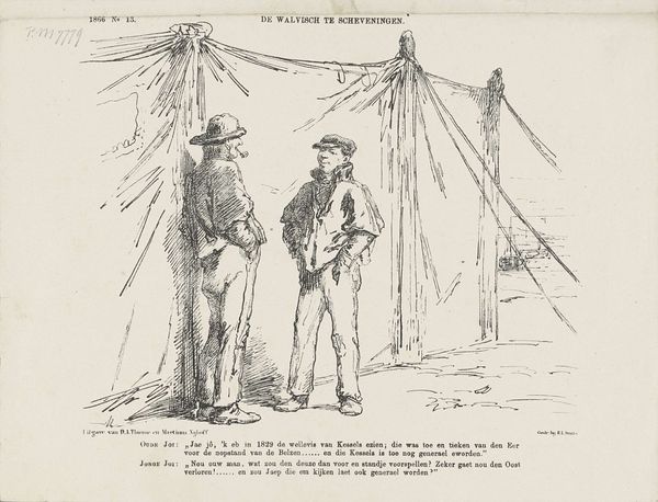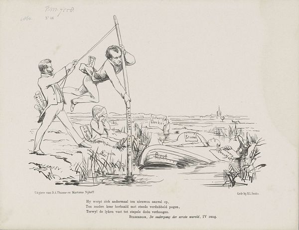 Editor: This is a drawing from 1866 by Johan Michaël Schmidt Crans called "Spotprent op de slechte toestand van de nationale defensie," which translates to "Cartoon on the Poor State of National Defence". It seems like a commentary on the military, rendered in a somewhat comical style with pen and ink. What story do you think this artwork is telling? Curator: This piece, while seemingly simple, is steeped in political and social critique. Consider the historical context: 1866. What major shifts were occurring in Europe? What emerging tensions might have impacted national defense strategies? Editor: I guess there were several wars brewing around this period in Europe, so maybe it’s pointing out that the Netherlands wasn’t really prepared for conflict? Curator: Precisely! The caricature style mocks the figures of authority, reducing them to these almost pathetic characters. Notice the body language, the expressions... how might those physical depictions speak to broader anxieties about national strength and identity? Where does the artist position blame? Editor: I see what you mean. The artist isn't just making fun, they're using humor to make a serious statement about governmental failure, it almost feels like calling out those in charge for their ineptitude. Curator: Exactly. Art like this serves as a vital historical document, giving us insight into the public sentiment. Political cartoons and caricatures often have the power to sway public opinion and encourage people to act. How might something like this have been received back in 1866, considering all of this? Editor: I imagine it was controversial! But probably it sparked discussions, or even fueled social change through satire. I’d never thought of cartoons this way before. Curator: Hopefully you'll remember from this context to also ask about current "fun" or "innocent" visual content too!