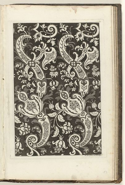 This ornate design was made by Daniël Marot, a French-born designer working in the late 17th and early 18th centuries. It's a print, meaning that the image was likely incised into a metal plate, inked, and then transferred to paper. The visual effect here relies on a stark contrast between black and white, creating a complex, symmetrical pattern. This highly stylized image is teeming with motifs of classical urns, grape bunches, birds and foliage. Marot was known for bringing French Baroque design to other parts of Europe, particularly the Netherlands and England. Prints like this one were often used as source material for artisans. Furniture makers, weavers, and other craftspeople would adapt these designs to their own materials and techniques. So, while this print is a work of art in its own right, it's also a testament to the flow of ideas and the vital role of skilled labor in bringing designs to life across different media.