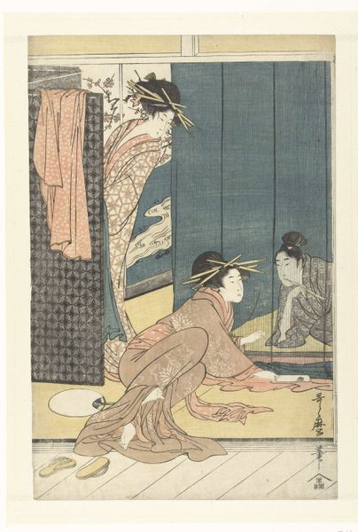 Curator: Look, a woodblock print crafted around 1800 by the ingenious Katsushika Hokusai. It's titled "Woman Holding a Song Book," currently held in the collection of the Rijksmuseum. Editor: The quiet mood that emanates from this…she’s standing so still, yet that incredible textile shouts. Does it have anything to do with this concept, 'Ukiyo-e', as per one of the labels? It's almost meditative in its geometry. Curator: 'Ukiyo-e', floating world... capturing fleeting moments and ephemeral beauty. I think her robe, indeed, embodies that. Its design isn’t simply decorative, it mirrors the complexities of life. What interests me are these diamond and rectangle patterns, all interconnected; it makes me wonder whether these forms had more than a purely visual effect, possibly linked to a profession like acting, with those theatrical backdrops featuring geometric grids and spatial awareness in kabuki performances. Editor: Speaking of performance, think about the labour that went into that print. Woodblock prints involve numerous artisans; the original artist, the block carver, and the printer. How the textiles are so intricate, and the patterns precise… what kinds of skills, division of labour, and technologies are needed to create this illusion of seamlessness between image and fabric, each dependent on the other for its effect? And how the materiality shifts… paper that imitates textiles that can imitate theatrical spaces. Curator: The songbook she cradles – what music filled the air when these were sung? Were they ballads of love, laments of longing? The song book gives me hope it represents a voice that challenges, consoles and moves us to our very core. A fleeting emotional narrative contained on such a fragile material. Editor: Indeed; these printed songbooks democratized music and poetry. The print as a method of disseminating cultural capital. That combination of individual skill, industrial method and communal art experience brings another layer into this discussion about ephemeral art, about that so-called "floating world.” The woman may float, but her clothes have grounding. Curator: Thank you for that rich tapestry of thought! This piece has offered us a lovely glimpse into the multi-faceted world of Ukiyo-e, prompting us to imagine narratives woven into both life, the world, and the beauty captured in a moment. Editor: It highlights not just the subject, but the production and dissemination of art as integral to its meaning. So much more than what it is, but what it does, too!