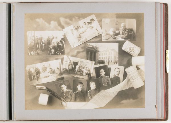 Curator: Looking at "Verbindingen", a gelatin-silver print made between 1942 and 1943, one immediately sees the almost overwhelming density of images tightly arranged in the frame. Editor: Overwhelming is right. It feels like a memory board, fragments desperately clinging together, hinting at a story just out of reach. The black and white, of course, contributes to the mood – very stark, almost haunting. Curator: Precisely. Its photographic realism pulls you in while its style harkens to German Expressionism. Each captured moment – a soldier on the phone, one scaling a pole, a small group conferring over what appears to be a map—speaks volumes despite its modest scale. Editor: Volumes of what though? That's what nags at me. There’s a tension here, wouldn't you say? Each scene feels staged, precise, yet... sterile. Is it supposed to feel disconnected, like these people are merely cogs? Curator: One could certainly interpret it through the lens of social critique, referencing perhaps the reduction of the individual under authoritarian regimes. The high contrast in the grayscale photography emphasizes the graphic quality, underscoring a sense of severity. Note also how each "connection", hinted at in the title, seems self-contained, rarely meeting or intersecting. Editor: That’s chilling! Like each scene is a discrete bubble, and the title “Connections” is cruelly ironic. Even the composition; those rigid boxes further emphasize that isolation. Curator: Indeed, the piece provides a poignant commentary on that fractured, regulated sense of experience. The materiality too, being a physical photograph, lends a starkness to the depicted reality, a feeling of almost unbearable record keeping. Editor: You know, seeing it this way has completely shifted my perspective. Initially, I just felt a sort of detached melancholy. Now, I perceive a more pointed commentary, a critique carefully embedded in each photographic frame. It makes it infinitely more disturbing. Curator: That interplay between the intimate detail and the overarching formal design speaks, perhaps, to the layered nature of the experience being conveyed. The aesthetic and the conceptual intertwine to underscore both alienation and complicity. Editor: Absolutely. And that, ultimately, makes it a far more profound artwork than I initially grasped. I’ll certainly not forget "Verbindingen" anytime soon.