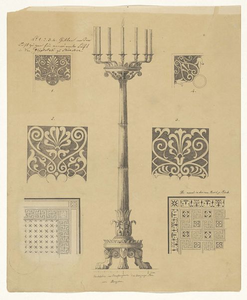 Curator: Good morning. We’re looking at "Oeuvres de Sculptures en Bronze", or "Works of Bronze Sculpture", a print by Jean François Forty, dating back to 1788. Editor: It’s a remarkably intricate etching. The overall mood is…stately, almost regal. I’m struck by the precision of the lines; they give the chandelier a tangible presence. Curator: Indeed. Forty’s use of line is exemplary, isn't it? Notice how the meticulous detailing creates a play of light and shadow, defining the form with clarity and depth. It’s Neoclassicism distilled. Editor: The craftsmanship is undeniable, but consider the material reality implied. Bronze—the cost of the material itself, the labour involved in its casting, the specialized skill needed for the etching process. It speaks to a culture of patronage. Curator: That is a good point. But let’s consider the chandelier as a formal arrangement of shapes and volumes. The central axis anchors the composition, allowing the surrounding decorative elements to gracefully spiral outward. What does it symbolize? Enlightenment ideals, grandeur. Editor: I see your point about grandeur but what about how the artist makes the print seem accessible through the etching? Instead of solely viewing the etching as simply about enlightenment, grandeur and ideals it speaks volumes about the materials. Curator: I agree. Editor: It does present a compelling challenge to the hierarchy of artistic practices. We could argue that printmaking brings an element of democratized production into high decorative art. Curator: So the lines blur then between craft and design and representation, complicating any single narrative about artistic value, don’t they? Editor: Absolutely. Examining art through both our lenses reveals deeper connections between the aesthetic and the material, and the broader context of its creation and reception. Curator: Agreed. Jean Forty provides a fascinating point to reflect on the dialogue between object, form, labor and ideas that shape art.