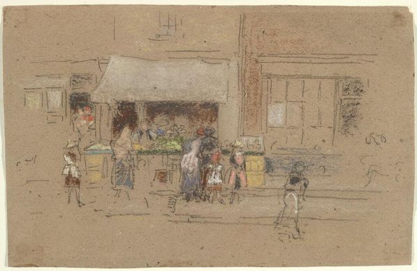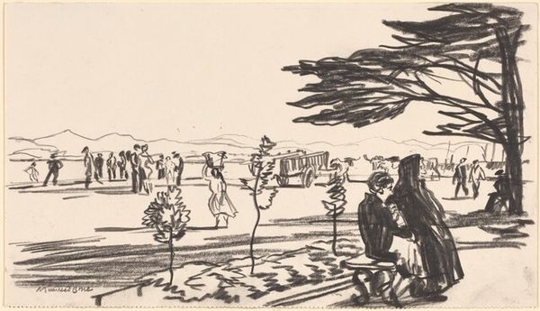 Editor: This woodcut print, "Girls with Wagon" by Vera Myhre from 1951, has a strangely nostalgic feel. The bare trees and muted tones make me think of a chilly autumn day. How do you interpret this work? Curator: It's fascinating to consider this piece in its historical context. 1951, post-war. Myhre's choice of the woodcut medium, traditionally associated with folk art and social commentary, becomes particularly relevant. The scene depicts everyday life, seemingly simple. But doesn't the starkness of the trees, the near absence of color, suggest a sense of... constraint? What's your feeling? Editor: Constraint... I hadn't thought of it that way. The girls and their wagon do seem a bit isolated within this urban landscape. So, is Myhre commenting on the social restrictions of the time through something as simple as this scene? Curator: Precisely! The woodcut, unlike oil painting for instance, lends itself to graphic representation, bold contrasts. Think about its history—how it was used to disseminate political ideas. Myhre uses a simplified style to amplify, perhaps, the feeling of restricted movement or limited opportunity within the urban environment of postwar reconstruction. Editor: It’s amazing how much social commentary can be packed into a seemingly simple image. The yellow adds to this mood, because it doesn’t come across as optimistic to me. Curator: The placement of yellow certainly guides your eyes and evokes this particular emotional reaction. Perhaps we need to think of art as public expression deeply embedded into sociopolitical context. That, to me, is the most compelling message of Myhre's artwork. Editor: I never would have thought to connect those things. I'm seeing this in a totally new light now. Thank you! Curator: Absolutely. That interplay between the artist, the social context, and the viewer is, after all, what makes art history so exciting.