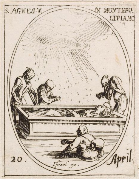 Editor: This is Jacques Callot's "Saint Antiochus," an etching. It's quite small, almost miniature. The figures have this frantic energy despite the small scale. What stands out to you about it? Curator: Considering Callot's etching process, we can appreciate the labour involved in creating such intricate lines. How does the reproduction of this image, likely intended for a wider audience, impact our understanding of the saint's narrative and its consumption? Editor: So, the printing process itself gave the artwork more reach? Curator: Precisely! The material act of reproduction democratizes religious imagery, shifting its value from purely spiritual to something more accessible and, dare I say, marketable. Editor: That's a completely different way to see it; I never thought about the printing process as part of the artwork’s message. Curator: Exactly. Recognizing the means of production allows us to understand its cultural impact more thoroughly.