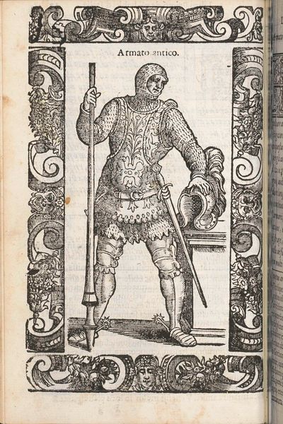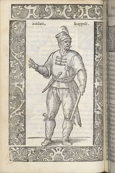 Curator: Here we have "AZZAPPI," an engraving by Christoph Krieger, dating back to 1598. Editor: The intricacy of the line work grabs you right away. It has a certain weight to it despite being so detailed and small. There's a sort of austere quality in the figure’s pose and in the stark contrasts between dark and light that defines his shape, clothing, and the background pattern work. Curator: Indeed. Krieger was working during a fascinating period where printed imagery was increasingly influential, acting as both disseminator of information and assertion of social standing. We see this dynamic at play, reflecting an engagement with foreign cultures viewed through a specifically European lens. The subject’s garb and weaponry clearly denote his ‘otherness’. Editor: Exactly. The focus is less on him as a man and more as a representation, even a caricature. Look at how the engraver employed repetitive marks to imitate a multitude of fabric textures: dense linear hatches depict the cloth folds, patterns for rich brocades, and contrasting patterns in the background. The lines are really working hard here! Curator: Which underscores the political aspect, as such visual representations helped shape early modern European perceptions of people and lands beyond their immediate purview. Remember too, that images such as this one served not just as aesthetic objects but, critically, as elements of a broader socio-political narrative defining the burgeoning European identity in relation to others. Editor: I'm particularly drawn to the hands – or the one visible hand, anyway. It’s awkwardly rendered, isn’t it? This suggests either the engraver didn’t have access to someone from this culture or his focus lay elsewhere… on the costuming as evidence of other cultures' resources and materials for import/export perhaps. It highlights how "accurate" visual data gets reshaped through power dynamics involved in image production. Curator: A crucial observation. The material conditions of its production were deeply intertwined with how the represented figure was then consumed. AZZAPPI reflects 16th century European engagement with global exploration but, viewed through the lens of power, ultimately reveals more about the gazer than the gazed upon. Editor: A beautiful point, a single sheet of paper, ink and labor, a global power play… It gets you thinking. Curator: Absolutely. It prompts reflection on the politics inherent in how art depicts culture, especially during times of exploration.