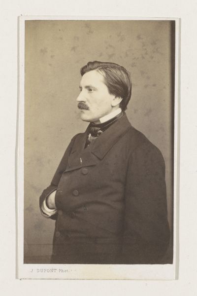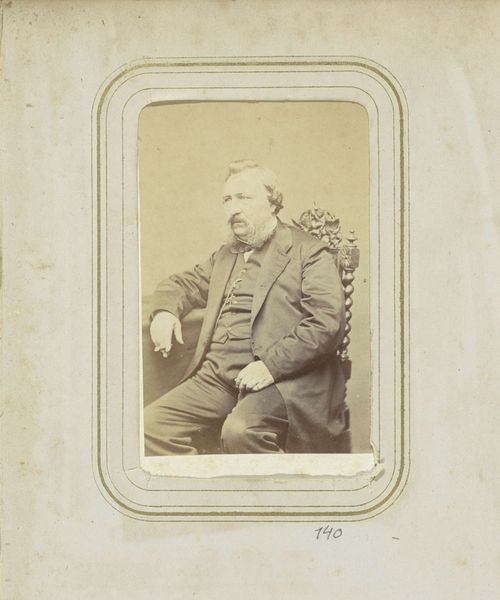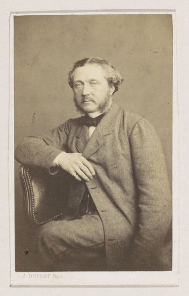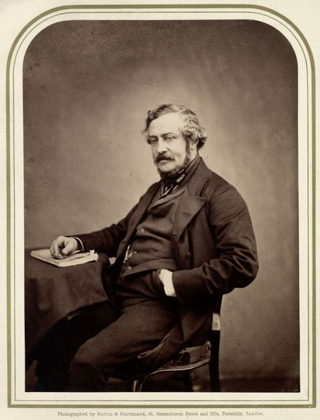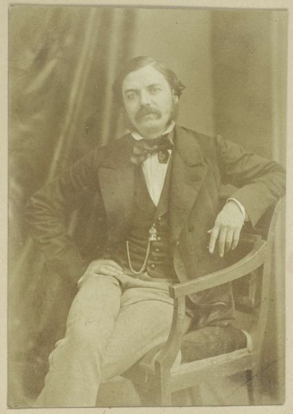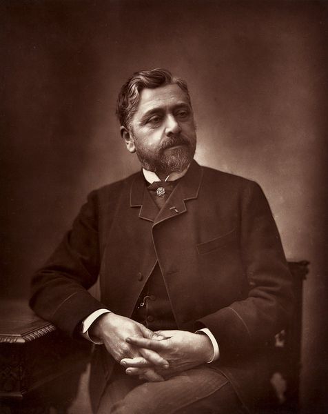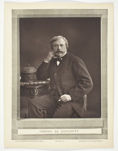 Curator: Here we have Felix Nadar's photograph of Edmond de Goncourt, a gelatin-silver print created in 1877. It's quite a striking portrait. Editor: Indeed! The sepia tones lend it an air of dreamy pensiveness. He looks rather formidable, doesn't he? Like a literary lion observing his domain. I almost want to know what he’s thinking. Curator: Well, let's consider what went into this image. Nadar, a significant figure in early photography, employed the gelatin-silver process. The remarkable tonal range achieved through this technique offers us a privileged gaze into the texture of Goncourt’s suit, and the surfaces around him. What statement was being made with photography here? Editor: A statement about posterity, perhaps. This isn't just a record, it's an carefully composed tableau. The books, the ornate box – are they props, signifiers of Goncourt's intellectual world, or do they suggest his position as an avid consumer? Curator: The question of consumption and how the image situates Goncourt is worth noting. Also consider the implications of democratized portraiture at the time. Before photography, portraits were largely restricted to the wealthy. But here is an author leveraging the relatively newer technology to present himself in a specific way, carefully styled in line with his class. Editor: Ah, but think too of the man! His hand posed just so, a cigarette dangling. There's a certain melancholy there, wouldn't you say? Beyond the carefully arranged set, there's a raw humanity that tugs at me. It's a study of a man contemplating something unseen, maybe his own legacy. Curator: Or maybe it is Nadar's calculated orchestration for this photographic "performance" as Pierre Bourdieu phrased it when discussing the social function of photography... Even the melancholic pose and Goncourt's carefully groomed look would be tools in promoting a certain authorial persona that would have exchange-value on the literary and social scene of 19th Century Paris. Editor: Well, whether a "performance" or a glimpse into a soul, it's certainly made me ponder the weight of representation and how much of ourselves we reveal. Curator: Absolutely. Seeing Nadar's attention to these developing methods lets you reflect on our endless quest to preserve, document, and, yes, to construct, our identities.