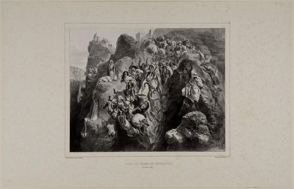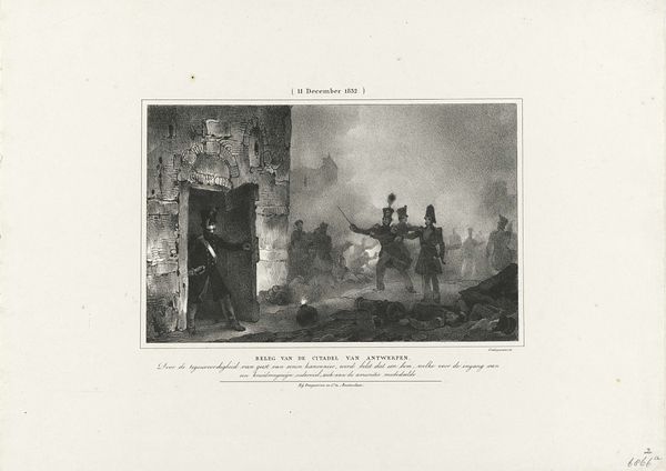 Curator: Welcome! We are standing before Richard Parkes Bonington's lithograph, "Château d'Arlay," which captures a vista with figures in the foreground. Editor: My first impression? Dreamy and slightly melancholic. It's like looking at a faded photograph from a cherished memory. Curator: That resonates with the Romantic sensibility Bonington often expressed. You see how the ruin itself, the château, dominates the scene. It stands as a relic of a bygone era. Bonington's decision to feature it aligns with Romanticism’s fascination with history. Editor: It's got this fantastic, crumbling grandeur vibe! I love the human element, though; figures at the base of it are like small brushstrokes—adds depth, suggests a narrative, even. Makes you wonder about their lives in the shadow of this place. Curator: Indeed! And Bonington wasn’t just depicting any chateau; Château d'Arlay, even now, is emblematic of France's rich aristocratic past, which would’ve had cultural implications even at the time of its creation. These types of images catered to an expanding art market hungry for landscapes tied to stories and heritage. Editor: Thinking about it, I love how hazy everything is. The contrasts aren't stark; instead, it blends it, like mist rolling through time itself. Lithography gave Bonington this awesome opportunity to play with tonal gradation. Look how subtly he modeled form! Curator: Yes, Bonington excelled at manipulating the lithographic crayon to create that atmospheric perspective. We see Bonington capturing a particular mood tied directly to that Romantic period – the picturesque. It allowed artists a medium to disseminate their vision of historical locales more widely and cheaply. Editor: Cheap might sell the artist short. To me, "Château d'Arlay" isn't just history; it's an emotionally charged place. It's that tug you feel when something beautiful begins to disappear. Curator: A compelling point! It illustrates the intersection of social forces, individual genius, and aesthetic movements at play in early 19th-century art. Thank you for those emotional insights, as they deepen our appreciation. Editor: Thanks to you, I'm now off to find out if Château d'Arlay had any juicy scandals to justify its picturesque decline! It was a delight exploring the picture and cultural echoes together.