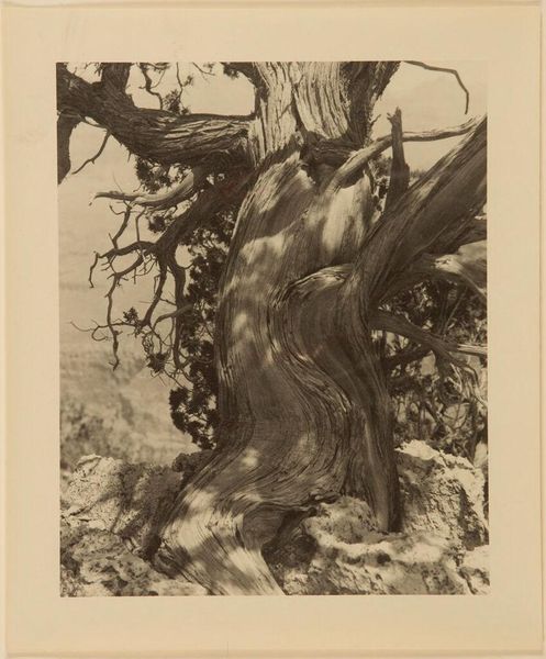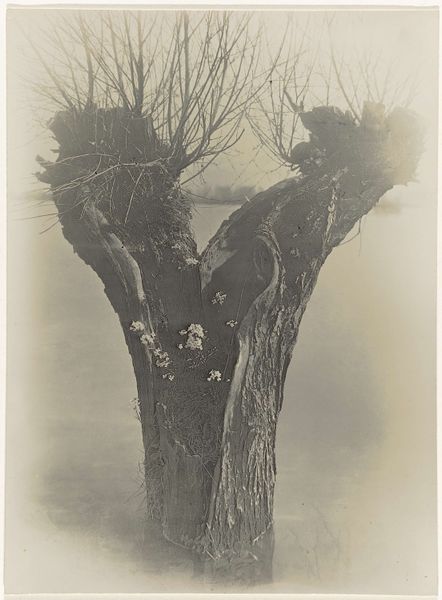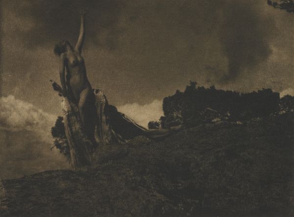 Editor: So, this is Anne Brigman's "The Heart of the Storm," a gelatin-silver print from 1914. The hazy quality gives it a very dreamlike feel. There’s a nude figure nestled against a gnarled tree during what looks like a storm. How do you interpret this work? Curator: The tree, contorted yet strong, is the most apparent symbol. Trees often represent resilience, knowledge, and the connection between the earth and sky. The nude woman, shielded within its branches, carries a potent symbolism. Does she represent vulnerability? Or perhaps a raw, unadorned truth seeking shelter? Editor: Interesting. I was thinking more of the storm as a metaphor. Maybe the nude figure is weathering an emotional crisis, finding refuge in the stability of nature. Curator: Exactly! Brigman, influenced by Symbolism, often uses the human figure to express universal emotions and inner states. Think of the "storm" not just as meteorological event, but as turmoil, struggle. Light halos around her head. Does that indicate suffering, enlightenment, hope? How do all of these interpretations make you feel about the piece? Editor: It makes me feel there are layers to peel back, even if there is no right answer. This idea of the figure almost merging with the landscape, but then this subtle suggestion of the divine, complicates things. Curator: It does indeed. The beauty of symbolism is in its ability to evoke layered meanings, reflecting cultural memory and tapping into universal experiences of vulnerability, strength, and spiritual seeking. We're left with more questions than answers. Editor: Absolutely. It’s prompted me to look at symbolism in photographs very differently. I assumed it to be more present in paintings and sculptures. Curator: Precisely! Photography can also portray our human experience by connecting us to something bigger. That’s the legacy Brigman leaves behind with her powerful photograph.