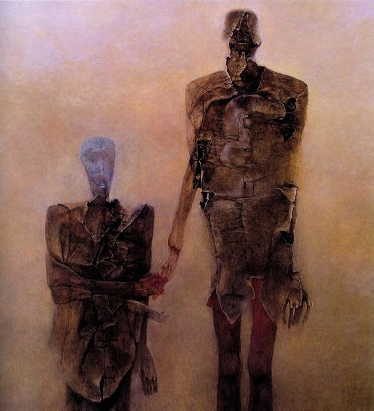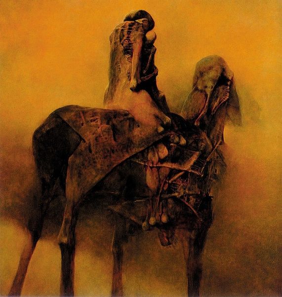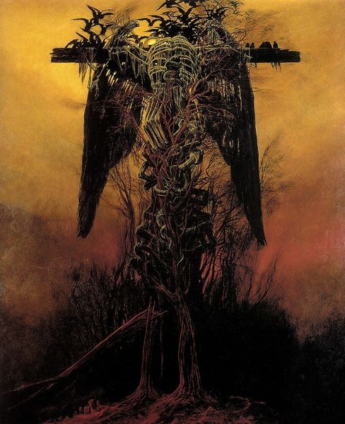 Curator: This oil painting, created by Zdzislaw Beksinski in 1973, is untitled, yet speaks volumes. What’s your initial take? Editor: Immediately, the visceral feeling is inescapable—oppression, the starkness of death, but there's also something disturbingly graceful about it, in a morbid sense. Curator: Indeed. Beksinski’s mastery is on display in his creation of texture here— the layering of oil paint, gives the scene a nightmarish quality. Note how this layering impacts the light. Editor: And that brings to mind so many issues, really. Consider the time it was produced. Think about how many lived under the terror of oppressive regimes, where the body itself became a site of political struggle. The symbolism is difficult to ignore; Beksinski paints not just an individual figure, but the potential erasure of autonomy under systemic power. Curator: The process itself is fascinating. Beksinski never named his pieces. He did very precise works—yet in his precision left room for his audience to fill in what they saw with their own subjectivity. Editor: Absolutely. It also engages with a long history of representing the nude body, and then subverting it. Instead of idealized forms, we have something emaciated, broken down, and yet presented. The erotic, the morbid and the social collapse. Curator: One could interpret it as commentary on mortality and decay. Note the construction here, with specific attention paid to the materiality of the piece – Beksinski wasn’t making throwaway art. Editor: This reminds me of Foucault's concepts of power, or Judith Butler’s work in thinking about gender performativity, in this twisted, dying expression of an impossible performance to survive... Curator: Yes, I would argue that Beksinski deliberately created works that inspire active, even aggressive readings! What do you make of the lack of horizon? Editor: Ah, yes, the artist removes any familiar context. Are we looking into the depths of hell or the individual soul? The message resonates, it evokes something incredibly uncomfortable and unescapable. Curator: Exactly! We might be left disturbed but not disengaged; which seems fitting to the process the artist wanted to foster in engaging with his pieces. Editor: This artwork truly forces us to confront the brutal realities of power and the vulnerabilities of the body and spirit.