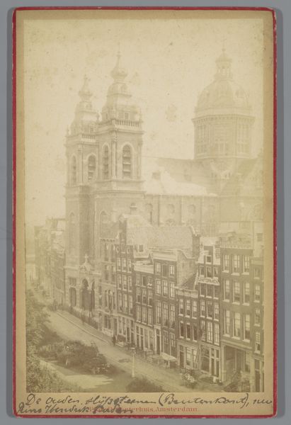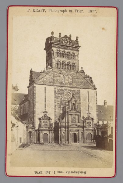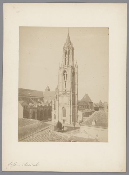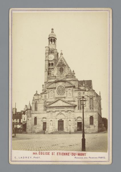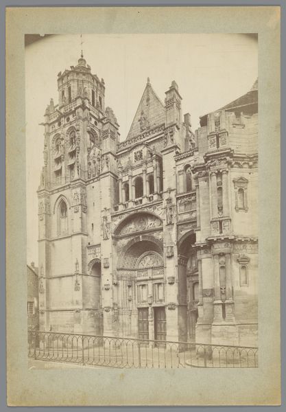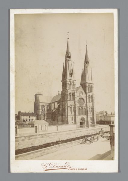 Curator: This photographic reproduction, created by Hippolyte-Auguste Collard between 1867 and 1880, presents a design by E. de Perthes for the Nouvelle Église Sainte-Anne-D'Auray. The use of etching gives it a striking linear quality. Editor: It has such an ethereal, dreamlike quality. The sepia tones soften the stone, almost ghosting the whole structure into existence. Curator: Exactly. Notice how Collard, likely working from an architectural drawing, employs both photographic and etching techniques. This fusion gives the image a distinct graphic clarity, emphasizing the architect's design and the play of light and shadow across its facades. Editor: Churches, cathedrals... they are such powerful symbols of community. I imagine that a 'new church', as the name suggests, would offer an invigorating new religious vision or serve as a response to a specific social climate during its conception and construction. Does Sainte-Anne carry local significance? Curator: Absolutely, Sainte-Anne-D'Auray is a significant pilgrimage site in Brittany. Saint Anne is the patron saint of Brittany. This design for the "new" church is charged with that devotional history, subtly but irrevocably linked to the community that calls this region home. Editor: Look at the figures in the foreground. They’re so small in comparison to the church that they emphasize how large and stately the church really is. But in all fairness, the church is small in comparison to its purpose; it should stand, imposing and unconquerable, over time. Curator: An excellent point. The scale, amplified by the photograph's perspective, not only demonstrates architectural grandeur but also hints at the church’s aspirational status—a testament to faith rendered in stone and light. The verticality of the spire, piercing upwards, it reinforces the transcendentality of its ultimate aim, reaching a hallowed ideal beyond mundane existence. Editor: Examining the linear nature of its components brings forth the divine structure of the church—the church for all the believers. It is quite beautiful when thought of in such a manner. Thank you for the time and insight. Curator: My pleasure, such analysis proves how the artwork embodies and communicates the architecture's intended presence.