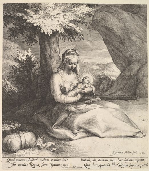 Curator: Let’s turn our attention to “A young girl with a sleeping shepherd,” an engraving by Giuseppe Maria Crespi, dating from between 1685 and 1747. Editor: This engraving is immediately striking! There’s an undeniable sense of… quiet intensity, maybe? It's interesting to observe its textures and its attention to detail, given the medium. What can you tell me about the sociohistorical background for Crespi's work here? Curator: Crespi worked in Bologna during a period of significant social and economic change. Genre paintings like this one, depicting everyday life, were becoming increasingly popular among the rising middle class. His style reflects an engagement with the naturalistic and informal aspects of life, also echoed in Dutch paintings from that era. However, there are undercurrents in this image which can be observed through class and gender relationships: note the girl’s active, almost menacing pose juxtaposed with the sleeping, perhaps vulnerable shepherd. Editor: Good point. Let’s consider what it means that we can view it today as a “print,” designed to be reproduced and circulated fairly widely in its day. It speaks to access and consumption, right? This wouldn’t be the same as owning a singular painted canvas. And how does that shift in the relationship between the image and the viewer shift power dynamics within a patriarchal society? Curator: Precisely. Engravings democratized art to an extent, reaching a broader audience that may have been barred from viewing high art restricted in wealthier households. Think about the labor involved—the copperplate etching, the press, the inking and wiping... each stage had a role and a worker involved, whose hand and position shaped the final result. It highlights how these works moved through different social strata. Editor: Absolutely, Crespi’s attention to detail isn't just aesthetic, it’s informational too. His commitment to craft elevated a certain subject that might not have been deemed worthy in another era. Considering how wealth and gender intersect, you start wondering what narratives are really at play when seeing this servant with an authoritative air tending to her worker… Curator: Indeed, in some interpretations this raises compelling points of enquiry relating to gender, sexuality and subversion, complicating the surface depiction of mere idyllic leisure. Editor: Exactly. Crespi has definitely created a space ripe with historical nuances we might not consider at first glance. I wonder how that context transforms the relationship we have to ownership over materials… Curator: That’s an incisive remark on the broader shifts of material availability at the time.