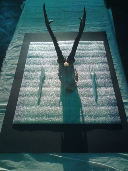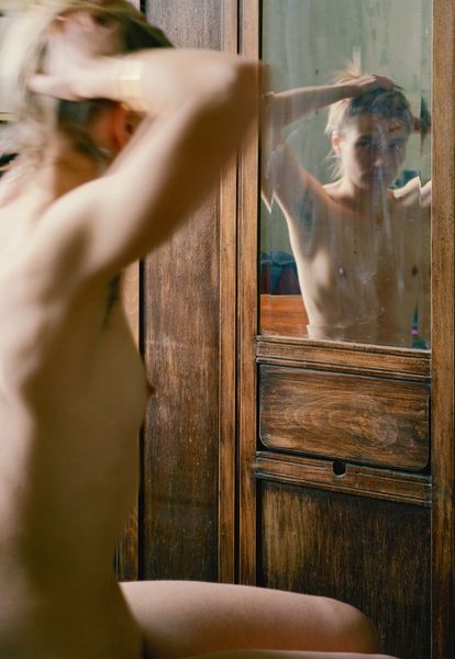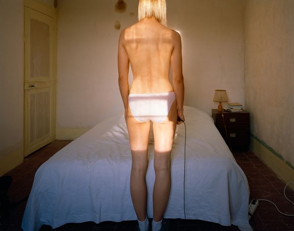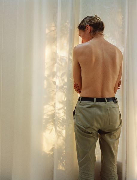 Curator: Here we have "Model Study 16", a 2008 photographic piece by Elina Brotherus. What strikes you most when you first look at this? Editor: Solitude, almost aggressively so. The back is turned, the shoulders are slumped – it suggests someone deeply in thought, or maybe even defeated. Then you have those scattered sandals on the side... remnants, relics, some symbols of leisure abruptly abandoned. Curator: That’s interesting, the “defeated” reading hadn’t struck me initially, but now that you mention it, the lighting—the sharp shadows that look almost like claw marks raking down the subject’s back—certainly adds a layer of vulnerability. It is a nude figure, but it also somehow refuses the viewer's gaze by showing the back of the person. Editor: Absolutely. It plays with the historical symbol of the female nude. Instead of sensual display, it suggests exposure of a different kind – a psychological one, perhaps. The artist is deliberately withholding something from us, subverting those long-standing tropes and expectations. It’s that contrast – the body partly exposed, yet emotionally closed off – that I find so compelling. The sun spot cast by foliage has an archetypal resonance -- life interrupted -- *vanitas* of simple pleasures. Curator: It makes you question your own role as the viewer. I wonder how much of Brotherus's intention here was to dismantle classical representation? How does she question our expectations when we encounter images of women in art? What does she propose instead? Editor: Perhaps it's an invitation to simply witness, to hold space for quiet introspection rather than demand revelation or beauty. The shadows might symbolize external pressures or societal expectations bearing down. It may propose not a disruption of established traditions, but a gentle redirect, allowing us to engage with ourselves through viewing a representation of our fellows. The back that is turned invites us to project. Curator: So it becomes almost a mirror reflecting our own inner states, rather than simply being an image of somebody else? Editor: Exactly. And the sandals reinforce this. You are forced to look at this portrait and ponder why their removal prompts feelings that seem universal in experience. Curator: The title itself also lends to this detached effect, referring to a “study.” That academic, almost clinical label takes away from an explicit understanding or interpretation. It positions the piece more as an observation. "Model Study 16" really removes the layers, no additional narrative context is given... Editor: ...allowing it to become more a meditation on vulnerability, solitude, and our complex relationship to looking. That's the joy in symbols, isn't it? The silence that prompts each of us to create a distinct song.