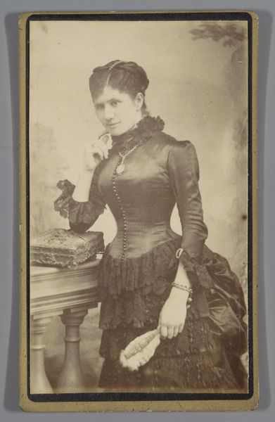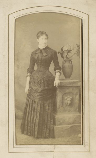 Curator: Here we have a striking photographic portrait from the late 19th or early 20th century, "Portret van een vrouw, staand bij een stoel in een decor." The albumen print captures a woman standing elegantly beside a chair. Editor: It immediately strikes me as both formal and somewhat dreamlike. The sepia tones lend a certain gravity, yet the backdrop seems almost theatrical, unreal. Curator: Precisely. Albumen prints were popular during this era for their sharp detail and smooth tonal range. This portrait is an excellent example, displaying a remarkable clarity despite its age. Look at the pattern of the dress and the detailing of the backdrop. It seems that the identity of the photographer remains with the name Photographie d'Amateur. Editor: The subject's dress is fascinating, those puffed sleeves especially. Their exaggerated form against the simplicity of the skirt is quite intriguing and definitely of its time, signaling an awareness of current fashions and social standing. I wonder, too, about the setting. Is it a real garden or a painted backdrop, meant to elevate the sitter's status through association with luxury? Curator: Likely the latter. Studios often used such backdrops to create an impression of grandeur, even for those of more modest means. It speaks to the democratizing effect of photography during this period, enabling individuals to project an idealized version of themselves. In those days, photography fulfilled that desire we all share now, the immortalization of self, preserved by image. Editor: You know, focusing on form, the oval composition, a classic frame to showcase the subject’s grace and poise, adds an element of intimacy. It concentrates the eye, compelling us to engage directly with the woman’s gaze. What a different kind of composition compared to square prints we see later on. Curator: Indeed, and the pose, standing but relaxed, is also quite typical. This was carefully orchestrated to convey both respectability and a hint of personality within the formal constraints of the photographic setting. Considering all aspects of this portrait, from materials to the chosen aesthetic of composition, we realize just how carefully images, like this, reflect what an era wants the rest of the world to know about itself. Editor: I completely agree. I hadn't considered how staged the scene seems and the level of work that went into capturing someone’s likeness to achieve this particular moment, to preserve someone to this extent. It adds layers of richness and also questions the narrative created by an image. Curator: An intriguing historical and artistic object for any photo lover, and definitely an important document.