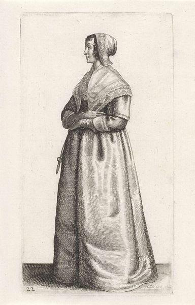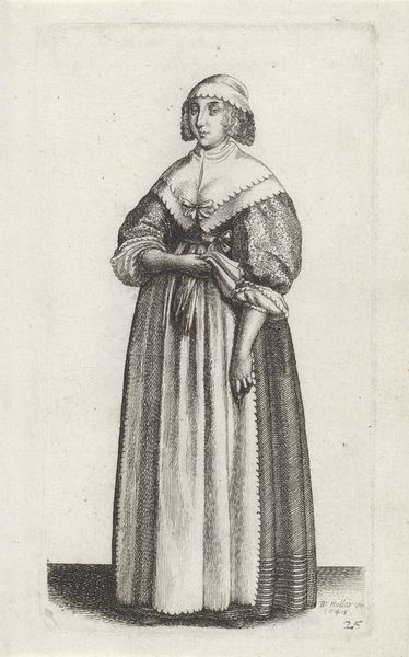 Curator: Welcome. Here we have a delicate engraving by Wenceslaus Hollar, dating from between 1638 and 1640. It's called "Engelse vrouw met zakdoek in de hand", which translates to "English Woman with Handkerchief." Curator: Immediately, the image strikes me as quite contained. The woman’s somber expression coupled with the modest fashion suggests a deliberate performance of restraint. Curator: The artist’s technique contributes significantly to that impression. Notice how Hollar uses dense, precise lines to define the contours of her clothing and create subtle gradations of light and shadow. The detail is truly remarkable, especially in rendering the textures of her garments. Curator: Precisely. And these clothes weren't simply fashion, but social indicators. This somber attire and her rather self-conscious pose seem very calculated—indicative of certain socio-economic conditions or potentially religious conventions typical of the time. Was the display of status perhaps related to the increase in global trading through the East India Company in the 17th Century? Curator: It’s an astute observation. The material quality—the fine linen, the folds and layers of dress—do imply status. Hollar's rendering gives dimension through meticulous execution rather than dramatic effect. Observe too, how he renders the contrast between the plain background, and her ornamented silhouette, almost architectural in its complexity. Curator: Agreed, her figure anchors our gaze, directing us to a particular kind of womanhood within early modern European culture. This woman isn’t overtly sexualized or presented as passive. Is she portrayed as a demure individual with agency, or an object with wealth and power. Is this artwork reflecting life, or merely a performance? Curator: That duality, I believe, stems from the delicate equilibrium between descriptive detail and subtle emotional restraint achieved through precise visual choices. Hollar masterfully controls the flow of line and the contrast between areas of detail to guide our interpretation. Curator: This piece truly provokes consideration beyond mere aesthetic appreciation—reflecting perhaps our own performance in the 21st century. Curator: Indeed. This work illustrates how keen observation and refined execution may prompt continued introspection over time.
