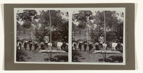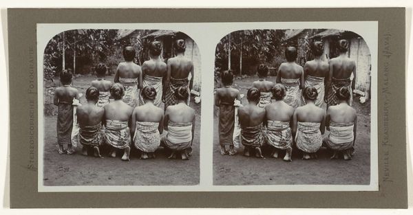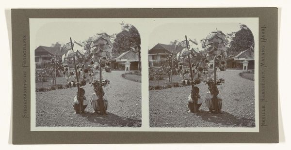Curator: This photograph, titled "Straatverkoop van gevlochten manden gemaakt door blinden in het instituut te Bandung," offers a glimpse into early 20th-century Java. The photographer, Neville Keasberry, captured this scene between 1900 and 1935 using the gelatin silver print method. Editor: There's a stillness to it that really grabs me. A quiet, poignant beauty, like a memory fading gently at the edges. Curator: It’s more than just a scene; the symmetry is striking, isn’t it? Almost like a diptych within a single frame. Each side mirrors the other, enhancing the composition. Editor: Exactly! That repetition emphasizes the work, doesn't it? Two figures mirrored, both offering the fruits of their unseen labor, and under that rather harsh sunlight I also get an undeniable sense of resilience here. Curator: Yes, but I think it goes deeper. Notice how the house in the background seems to ground them, a stable, unwavering form compared to the vulnerability of the figures in the foreground? It offers a counterpoint between shelter and exposure, institution and street. Editor: Ooh, I like that contrast. The architecture becomes a symbol. Are the baskets also symbolic do you think? What they represent of these figures work or the circle, a sort of Ouroboros? I get a sense they maybe point to sustainability and the turning of limitations into abundance. Curator: A powerful interpretation, yes. But from a formalist perspective, the texture of the woven baskets is also critical, as their roughness provides contrast, with the smooth surfaces of the building and even the clothing of the figures Editor: Right, that juxtaposition gives them life. And the baskets… it feels like so much more than a transaction. Like connection itself. We buy their work, but maybe they gain their worth. That's lovely and poignant. Curator: Indeed. So the piece has shown us something unique and timeless, not just about its subjects, but about us, too, or how we see what connects us. Editor: Precisely. A photo is frozen. But it makes us think of those things and more, right? We’re all just wandering this little blue dot, searching for meaning, making something beautiful, passing it on.