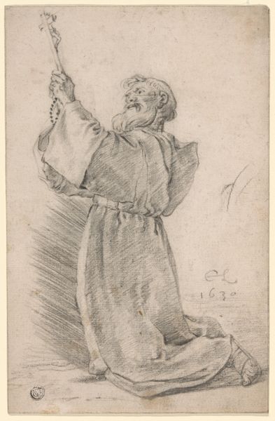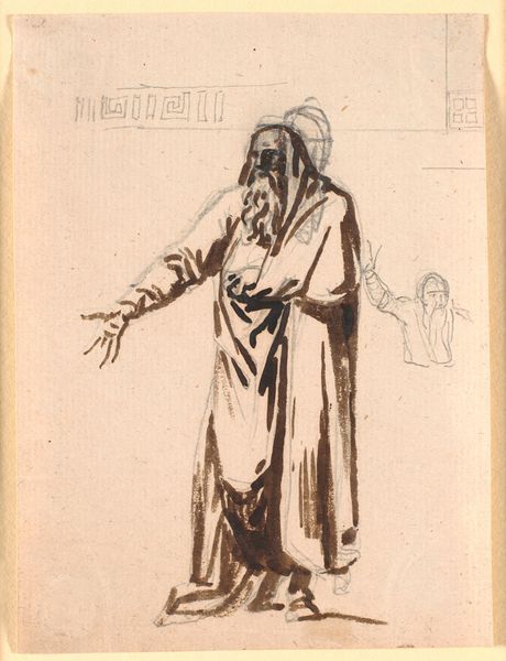 Curator: Paul Gavarni sketched this, "The wife of Cadrusse Carconte in 1829", around 1846. It’s rendered with what appears to be watercolor or a light pencil. I am intrigued by this figure. Editor: It has such an arresting atmosphere, stark even. The monochromatic palette lends it a sense of aged immediacy, like a memory half-faded yet viscerally present. The angle of the body... the composition directs us to read it downward from the figure, across the staircase, as though a drama has just occurred. Curator: It certainly presents a moment freighted with narrative potential. Consider the time—1846, decades defined by immense social upheaval, class struggle, and the tightening grip of patriarchal structures. Who was Carconte's wife, one wonders? The title implicates her through marital connection, positioning her initially as secondary, as merely 'the wife of' which certainly diminishes the subject, don't you think? Editor: Undoubtedly, and this marginalisation is echoed in the almost shadowy execution; however, the dramatic play of light and shadow across her figure also serves to accentuate the textured layers of her dress and the angles of her form. Curator: Indeed, and if we read those sartorial details, alongside her headscarf, we begin to get a sense of someone whose daily reality involved manual work and life near subsistence; but those heavy tonal contrasts have broader symbolic weight, don't they? Consider how the heavy shadows partially obscure her face... It makes one wonder about the untold stories carried by working-class women, their lack of public visibility, and their societal erasure in historical records. Editor: Interesting, yes. Thinking solely in visual terms, the texture and gradations achieved here within this restricted palette also invite one to deconstruct the artist’s process. Note the swift confident strokes defining the architectural elements; it is pure formal beauty. Curator: It's this nexus of aesthetic form and socio-historical meaning which really grips me with Gavarni's drawing here. I will be wondering about her, this Mrs. Carconte for quite some time. Editor: Absolutely, a captivating and unresolved tableau. It leaves a viewer wanting to decipher the semiotics and brushstrokes anew, each time gaining access to further layers of insight.