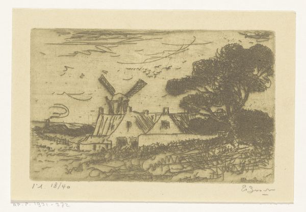 This delicate etching by Wijnand Otto Jan Nieuwenkamp presents a cluster of windmills along the Vlist, rendered with an emphasis on the density of line and tone. The limited scale draws us into a world meticulously crafted through the formal elements of line and texture. Notice the way the artist uses varied densities of etched lines to create depth and atmosphere. The closely packed lines in the sky and landscape contrast with the sparser lines in the water, creating a sense of recession and space. Nieuwenkamp’s use of line is not just descriptive; it’s expressive. The swirling lines above the windmills might evoke a sense of movement and energy. Consider how Nieuwenkamp organizes the composition, the windmills are not neatly aligned but rather staggered. This disrupts any sense of perfect symmetry. The artist seems less interested in idealized beauty, and more in capturing a particular experience of place, and how it challenges our perceptions of spatial relationships.